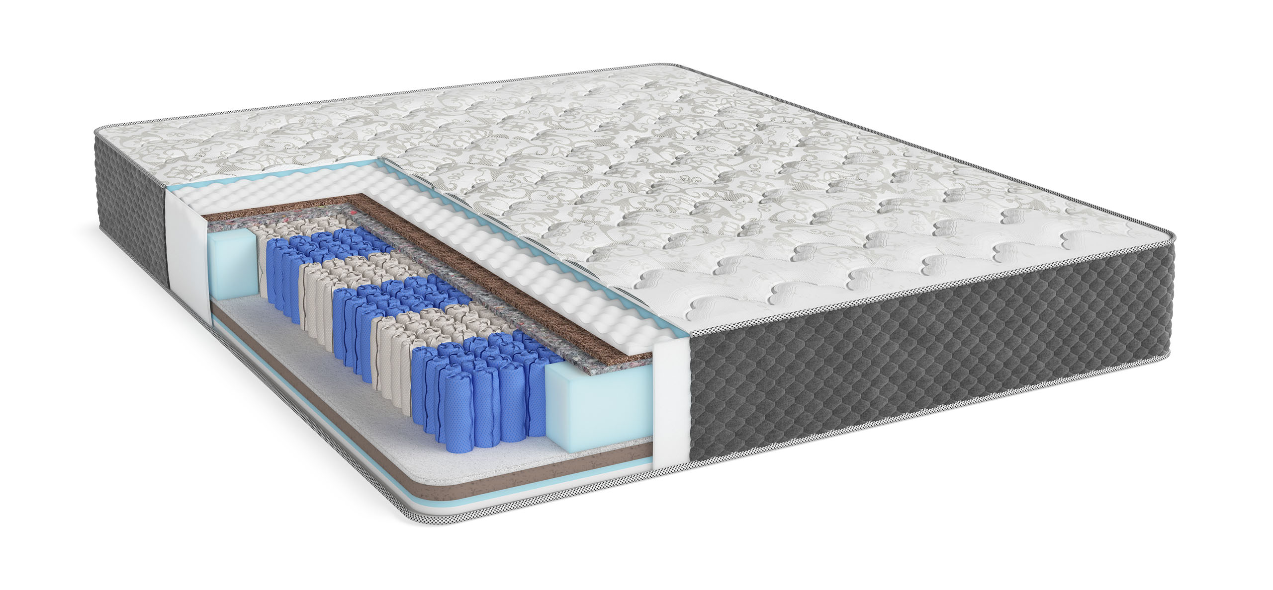 Наполнение Пена с эффектом памяти MEMORIX AIR, латексированная кокоcовая койра, термовойлок, НПБ KING SPRING 1500, слой BOSS SKIN, пена COPPERFOAM с частицами меди