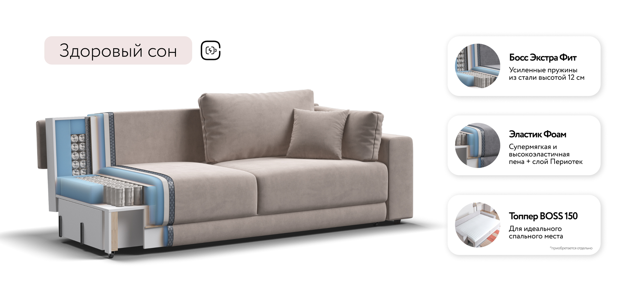 Босс Прайм — это сочетание современного дизайна и продуманной эргономики, создающее уютную атмосферу в любом интерьере. Визуально разделённое сиденье, широкие мягкие подлокотники и пышные подушки разного размера обеспечивают не только эстетическую привлекательность, но и максимальный комфорт.Оснащённый независимым пружинным блоком и высокоэластичной пеной Эластик Фоам с дополнительным слоем периотека, диван гарантирует анатомическую поддержку и комфортный сон. Простой и надёжный механизм трансформации «еврокнижка» позволяет легко преобразовать диван в просторное спальное место.