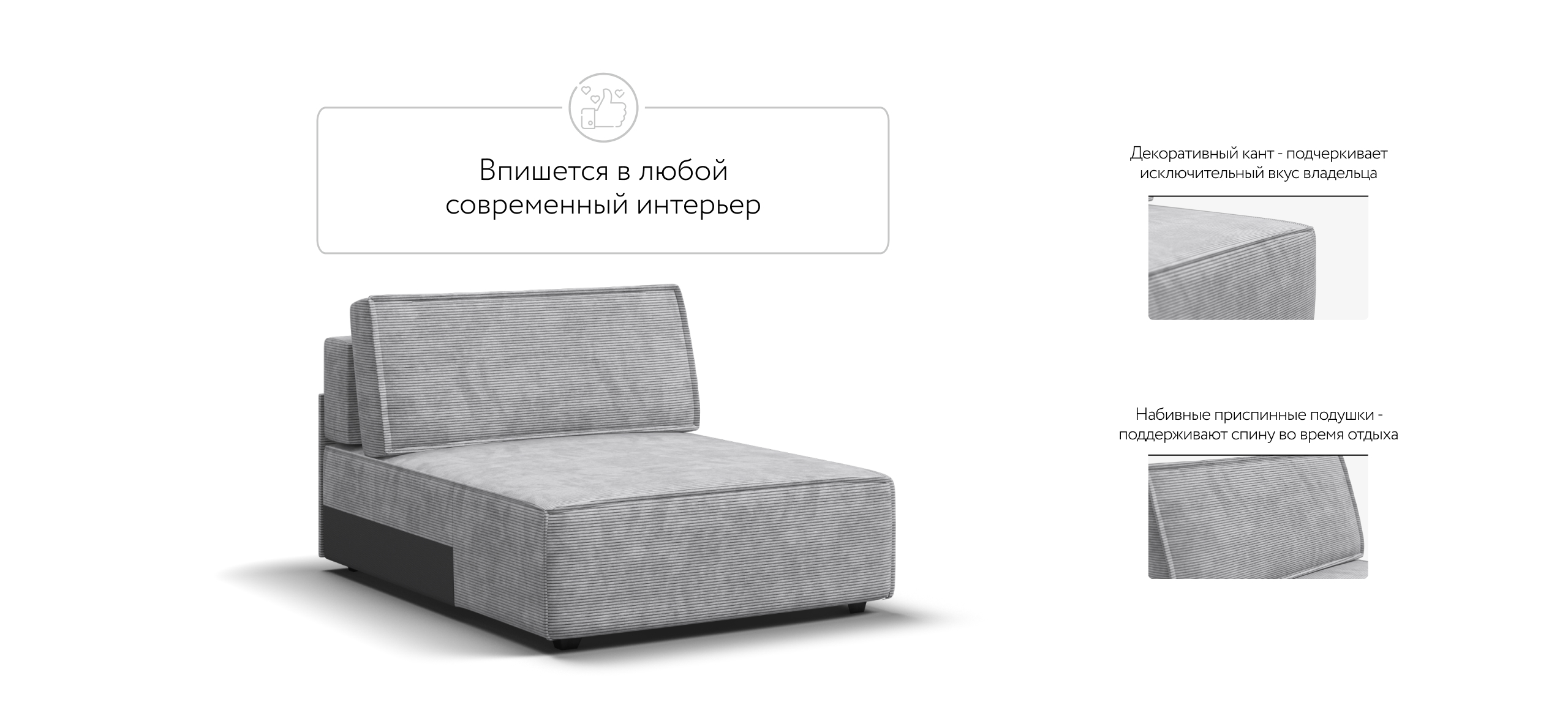 Оттоманка Босс Софт Модуль является частью модульной системы. Универсальная оттоманка может быть установлена с любой стороны комплектации. Мягкие приспинные подушки и высокоэластичная пена с дополнительным слоем Периотек создадут максимальный комфорт во время отдыха.