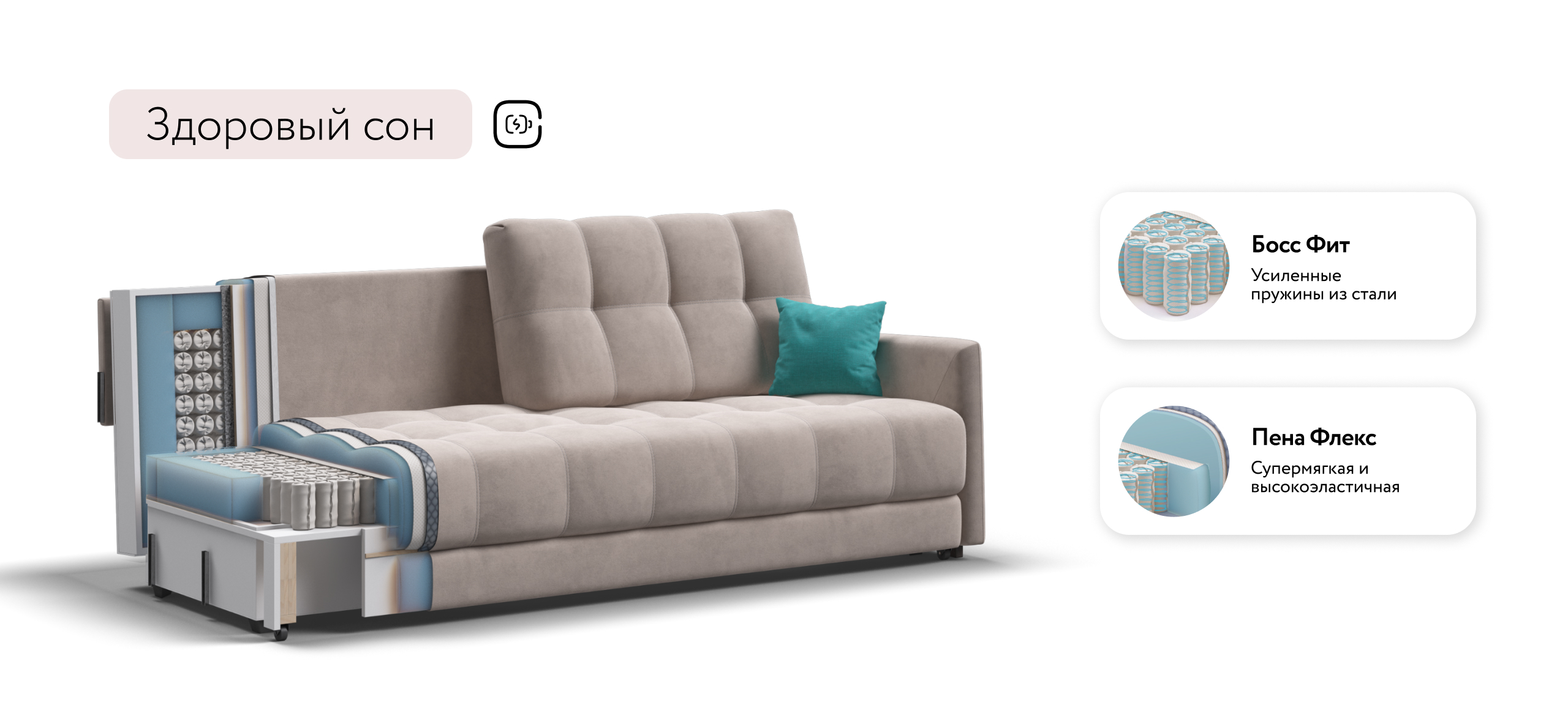 Легкая трансформация в три положения создаст для Вас максимально комфортный отдых, а улучшенное анатомическое основание в диване обеспечит Вам здоровый сон.