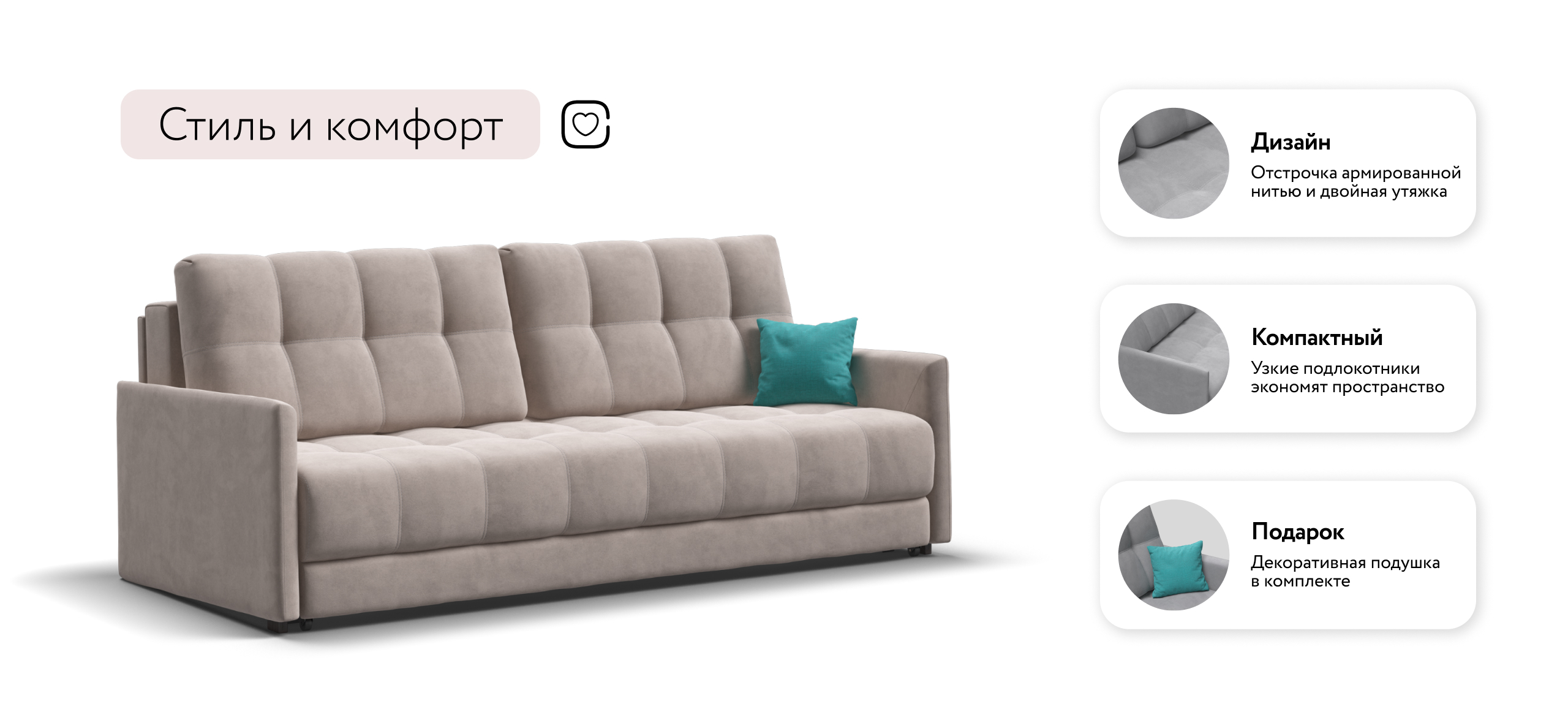 Благодаря дополнительному пуфу, который Вы можете приобрести к нему отдельно, прямой диван с легкостью становится полноценным угловым диваном.