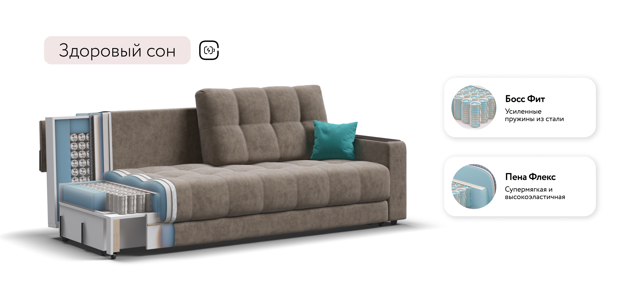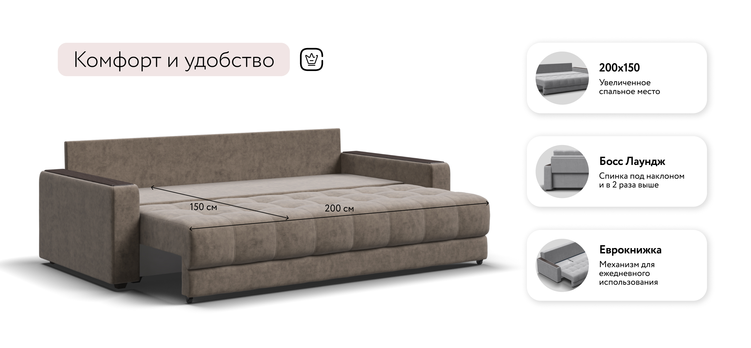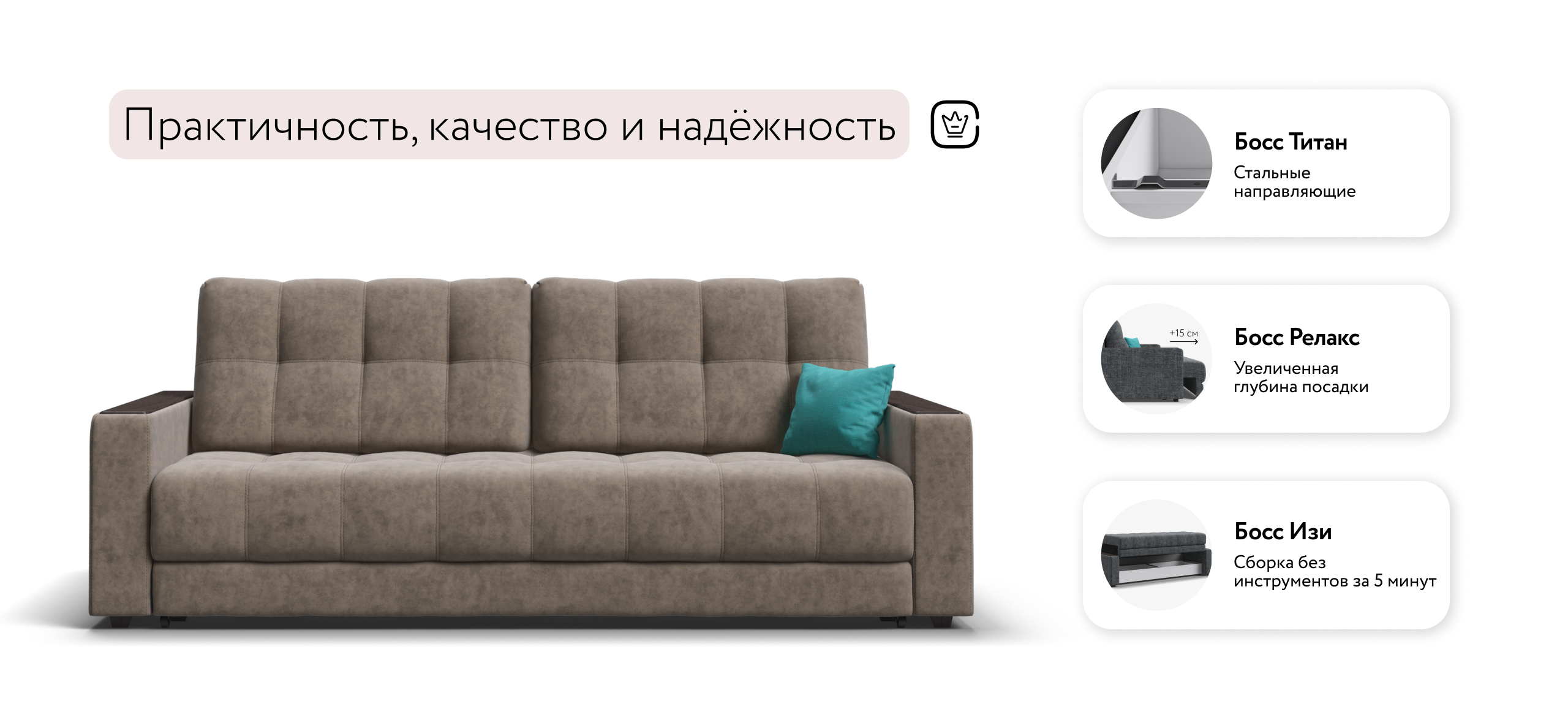 Стильный диван для тех, кто ищет максимальный комфорт. Продуманный до мелочей диван BOSS сочетает в себе надежный каркас, мягкие ткани, многофункциональность и быструю сборку за 1 минуту без инструментов - ощутите комфорт у себя дома!
