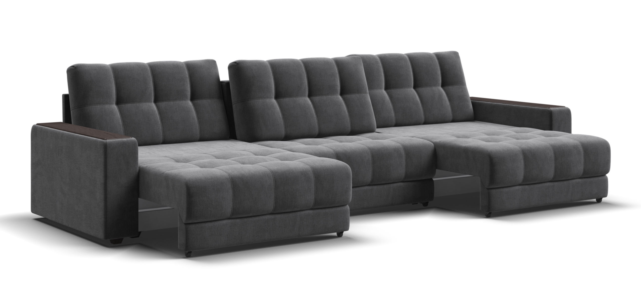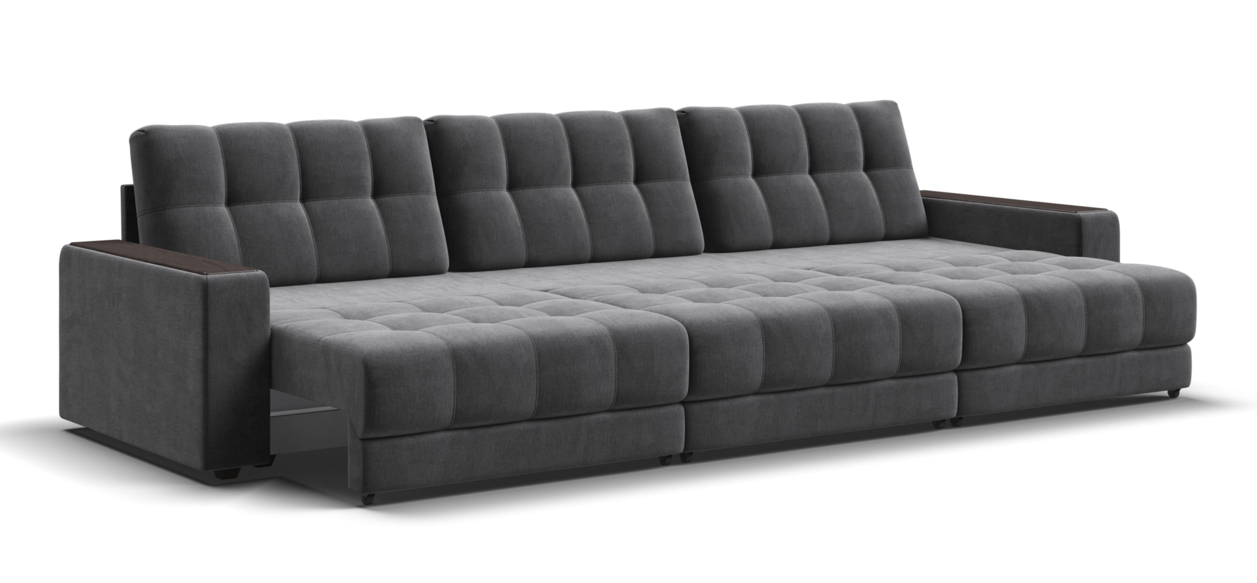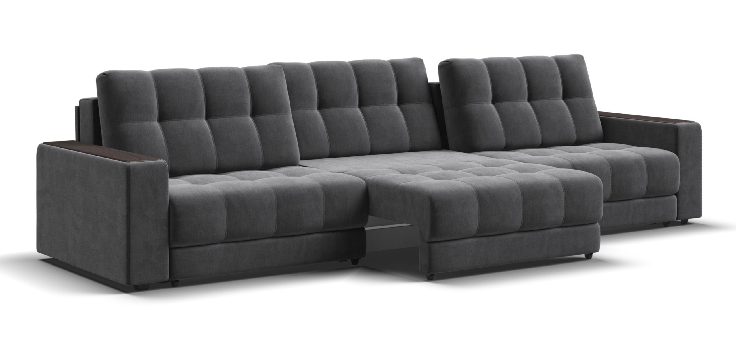 Каждое посадочное место выдвигается вперед и можно получить диван с правым или левым углом, а также получить П-образную форму дивана.