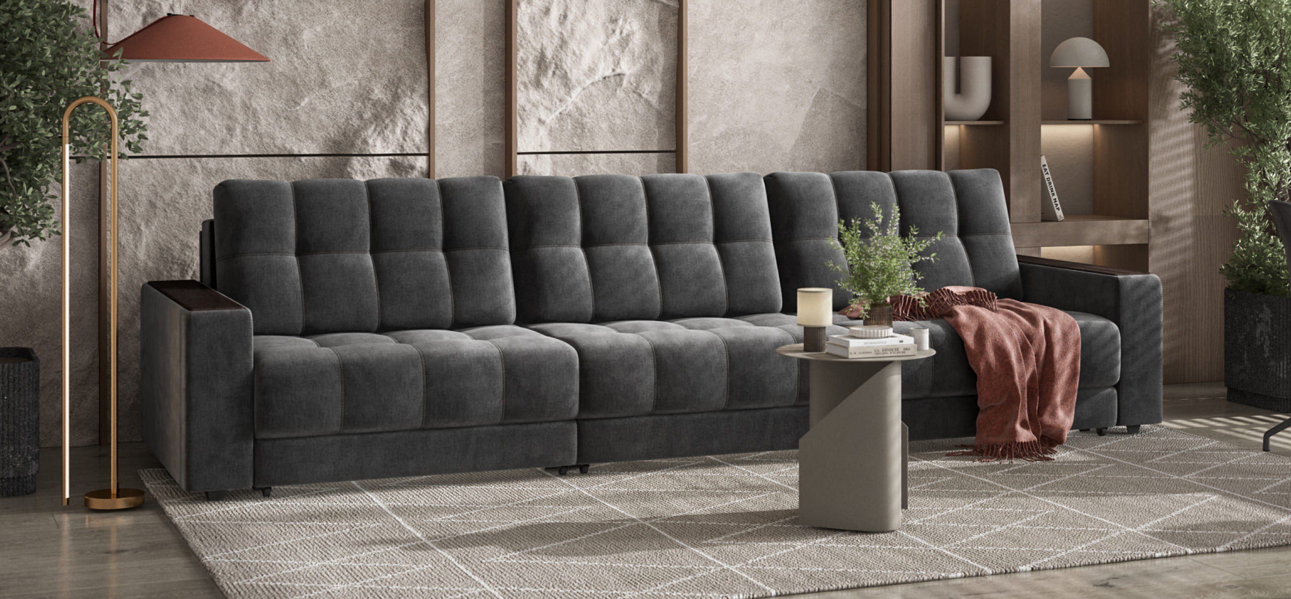 Диван Босс Гранд - большой, стильный и комфортный диван, предназначенный для просторной комнаты. Продуманный до мелочей диван Босс сочетает в себе надежный каркас, мягкие ткани, многофункциональность и быструю сборку за 1 минуту без инструментов - ощутите комфорт у себя дома!