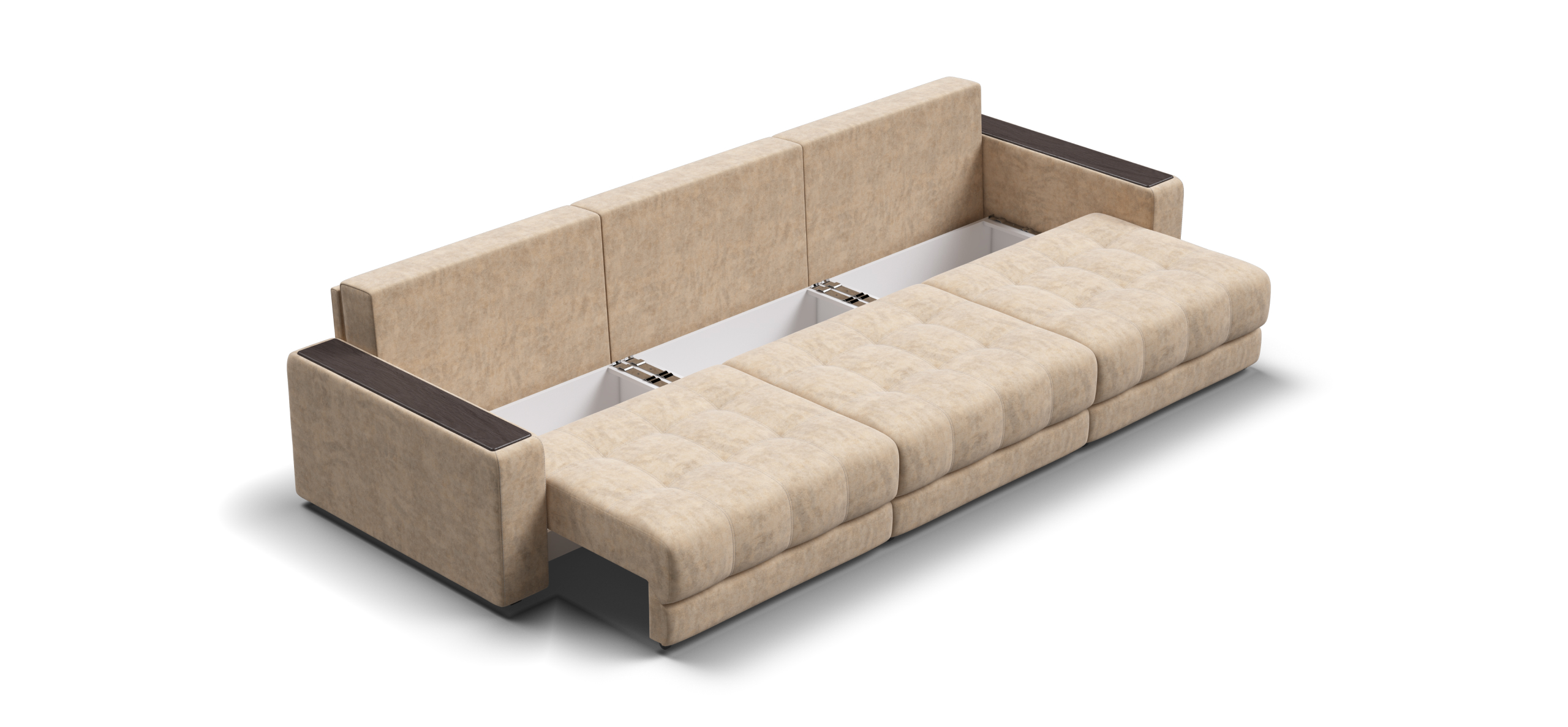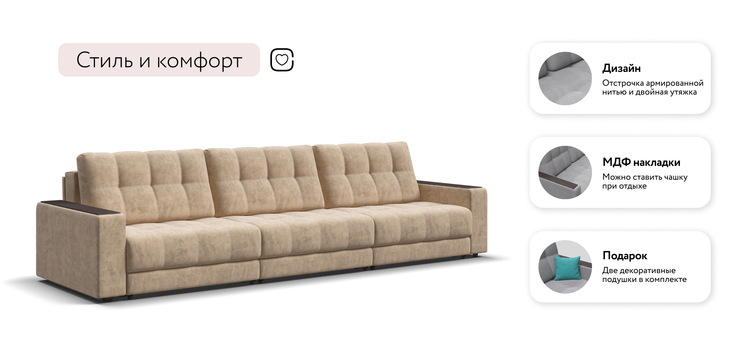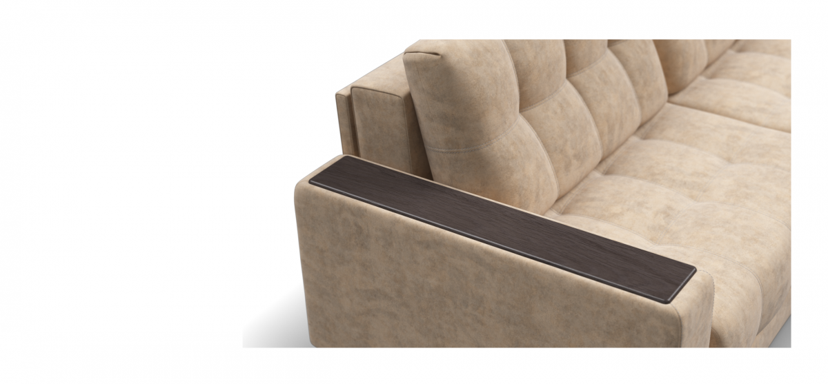 Каждое посадочное место выдвигается вперед и можно получить диван с правым или левым углом, а также получить П-образную форму дивана.