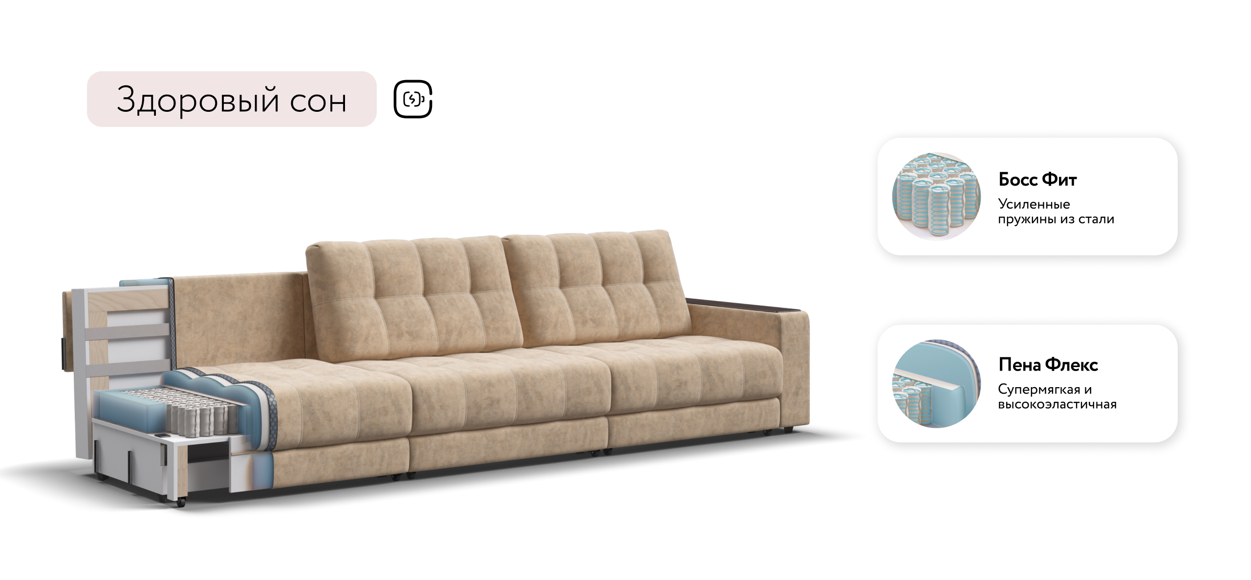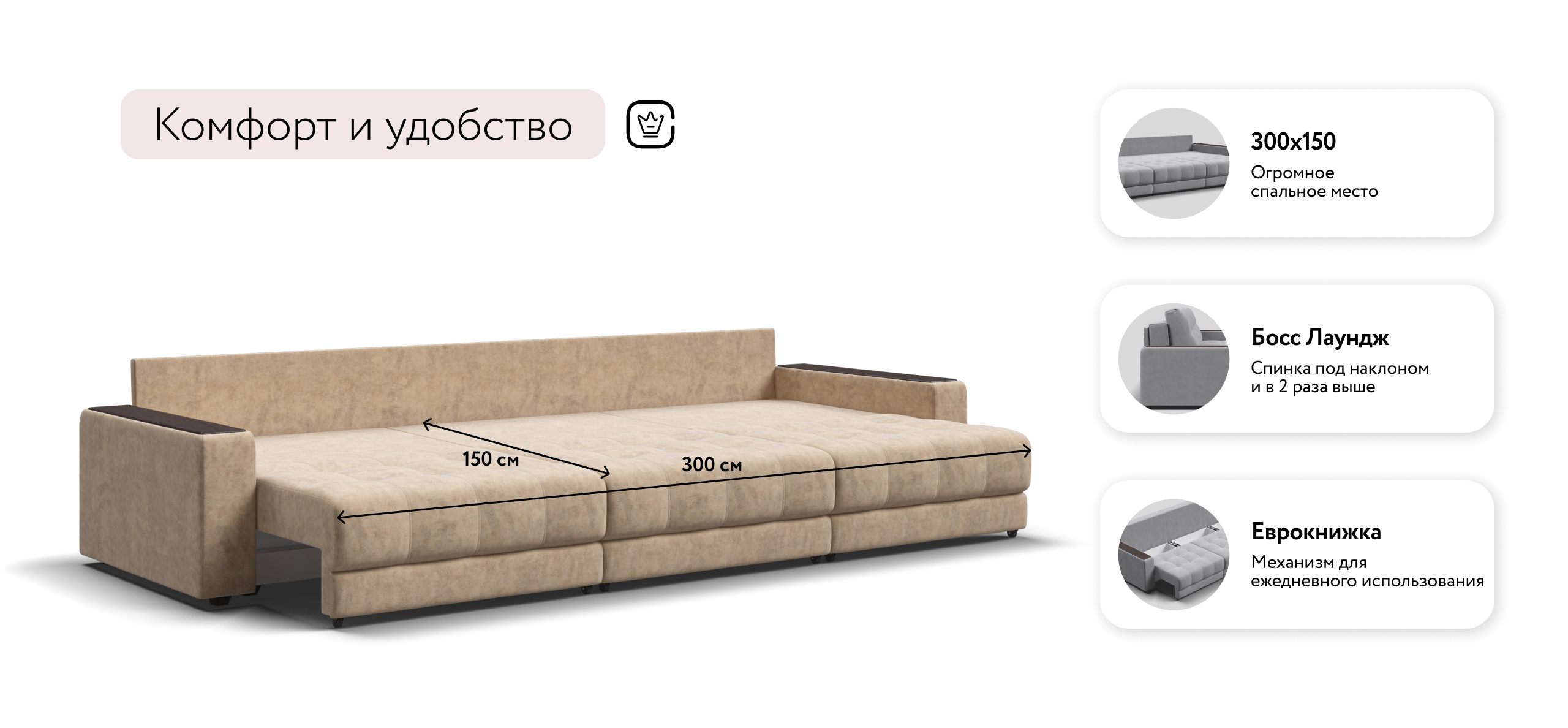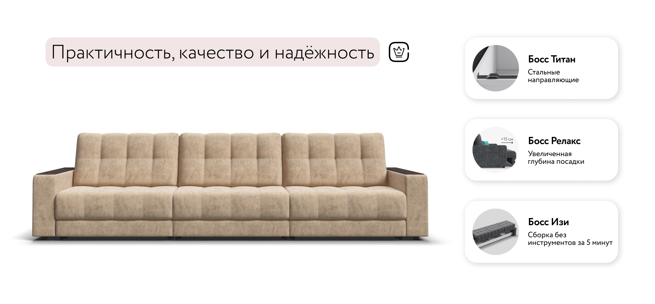 Диван Босс Гранд - большой, стильный и комфортный диван, предназначенный для просторной комнаты. Продуманный до мелочей диван Босс сочетает в себе надежный каркас, мягкие ткани, многофункциональность и быструю сборку за 1 минуту без инструментов - ощутите комфорт у себя дома!