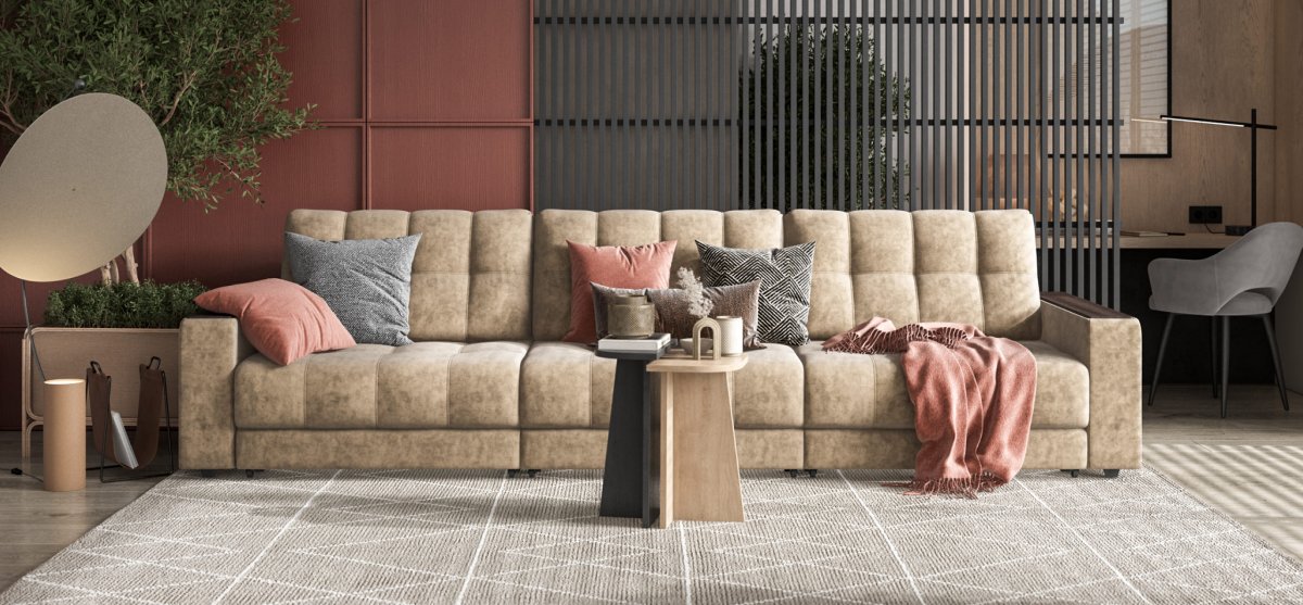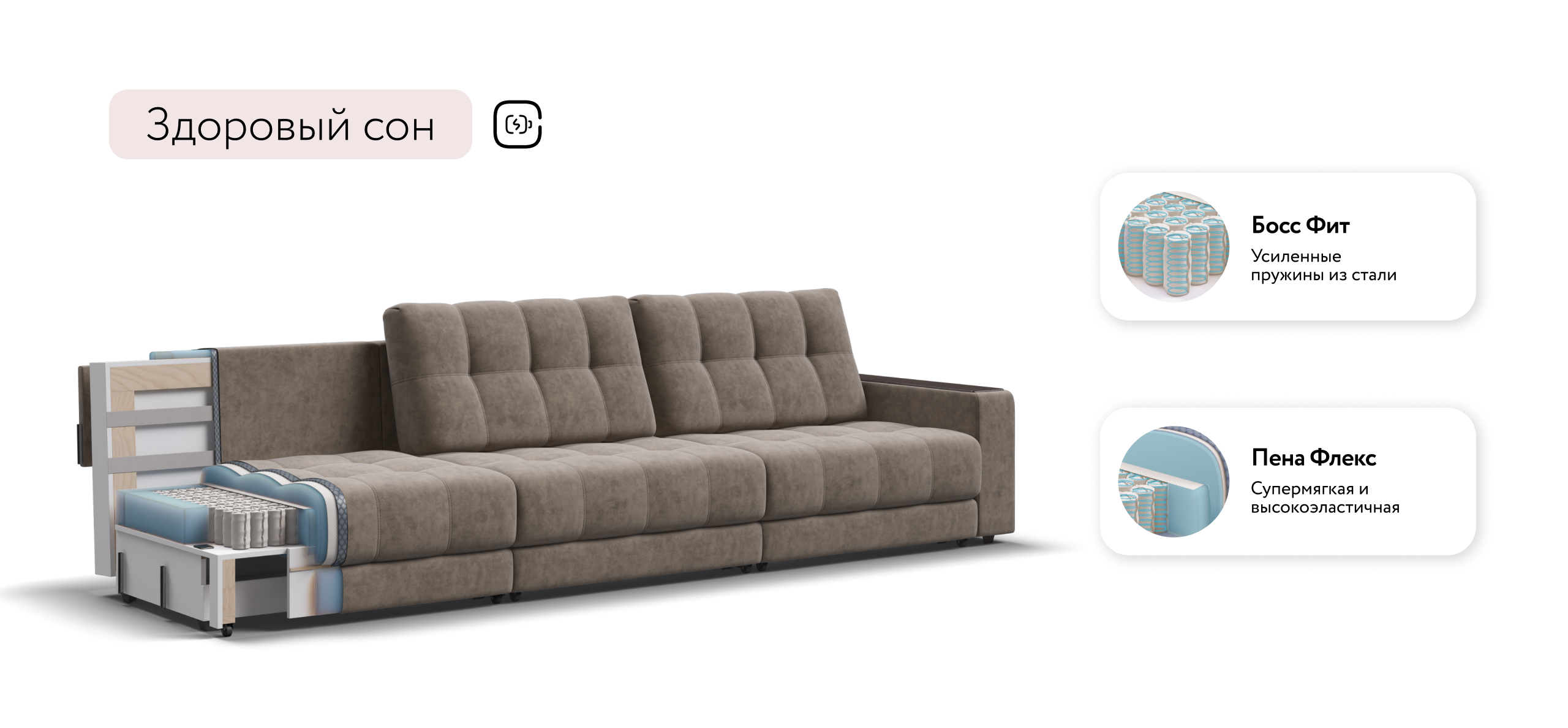 Диван Босс Гранд - большой, стильный и комфортный диван, предназначенный для просторной комнаты. Продуманный до мелочей диван Босс сочетает в себе надежный каркас, мягкие ткани, многофункциональность и быструю сборку за 1 минуту без инструментов - ощутите комфорт у себя дома!