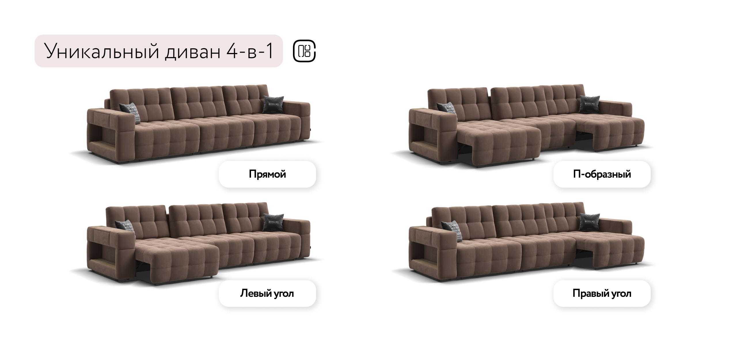 Босс ХО Макс - это и прямой, угловой и П-образный диван сразу, за 10 секунд вы можете превратить его в правый или левый угол, а также в П-образный.