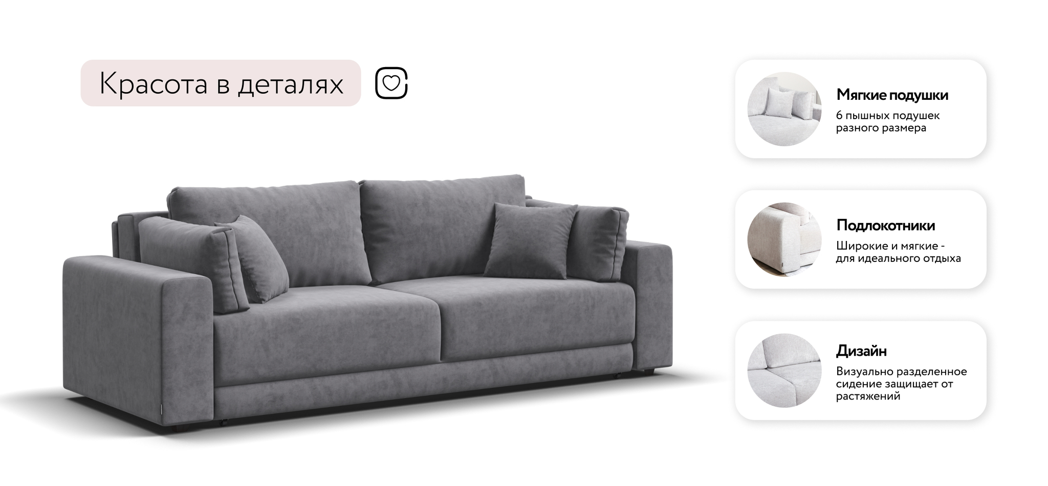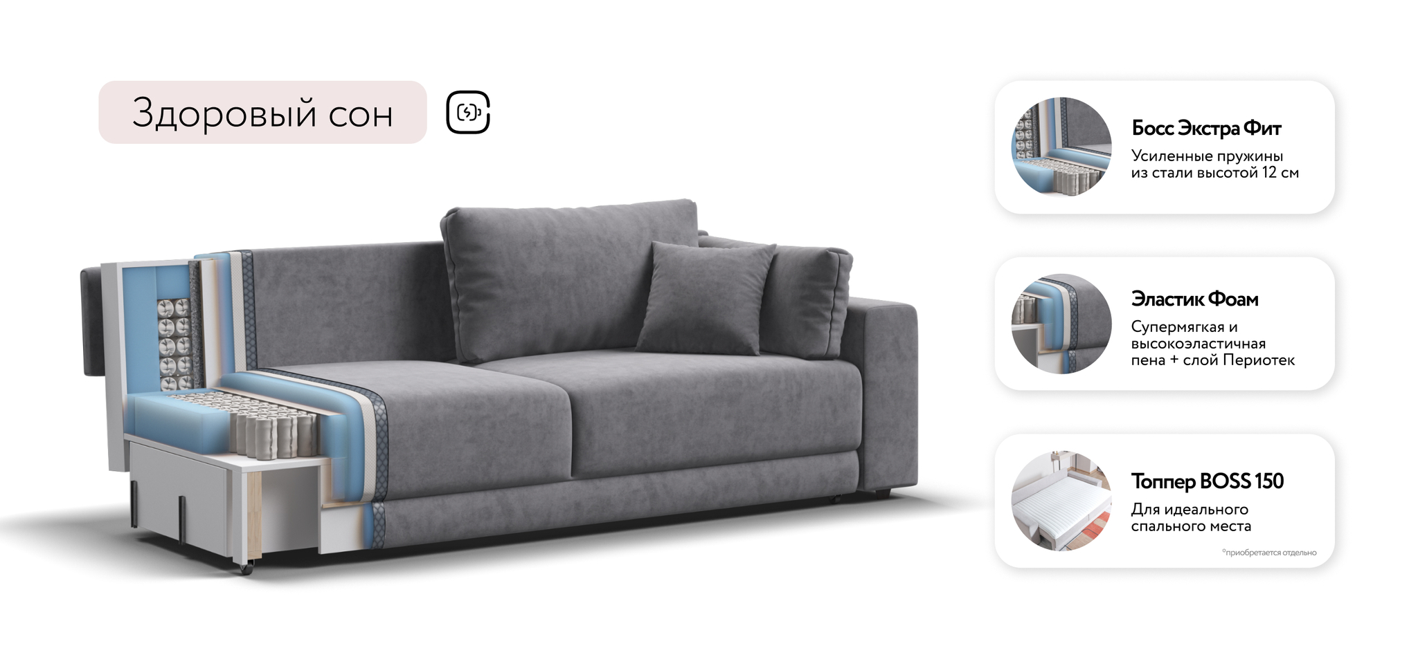Босс Прайм — это сочетание современного дизайна и продуманной эргономики, создающее уютную атмосферу в любом интерьере. Визуально разделённое сиденье, широкие мягкие подлокотники и пышные подушки разного размера обеспечивают не только эстетическую привлекательность, но и максимальный комфорт.​Оснащённый независимым пружинным блоком и высокоэластичной пеной Эластик Фоам с дополнительным слоем периотека, диван гарантирует анатомическую поддержку и комфортный сон. Простой и надёжный механизм трансформации «еврокнижка» позволяет легко преобразовать диван в просторное спальное место.