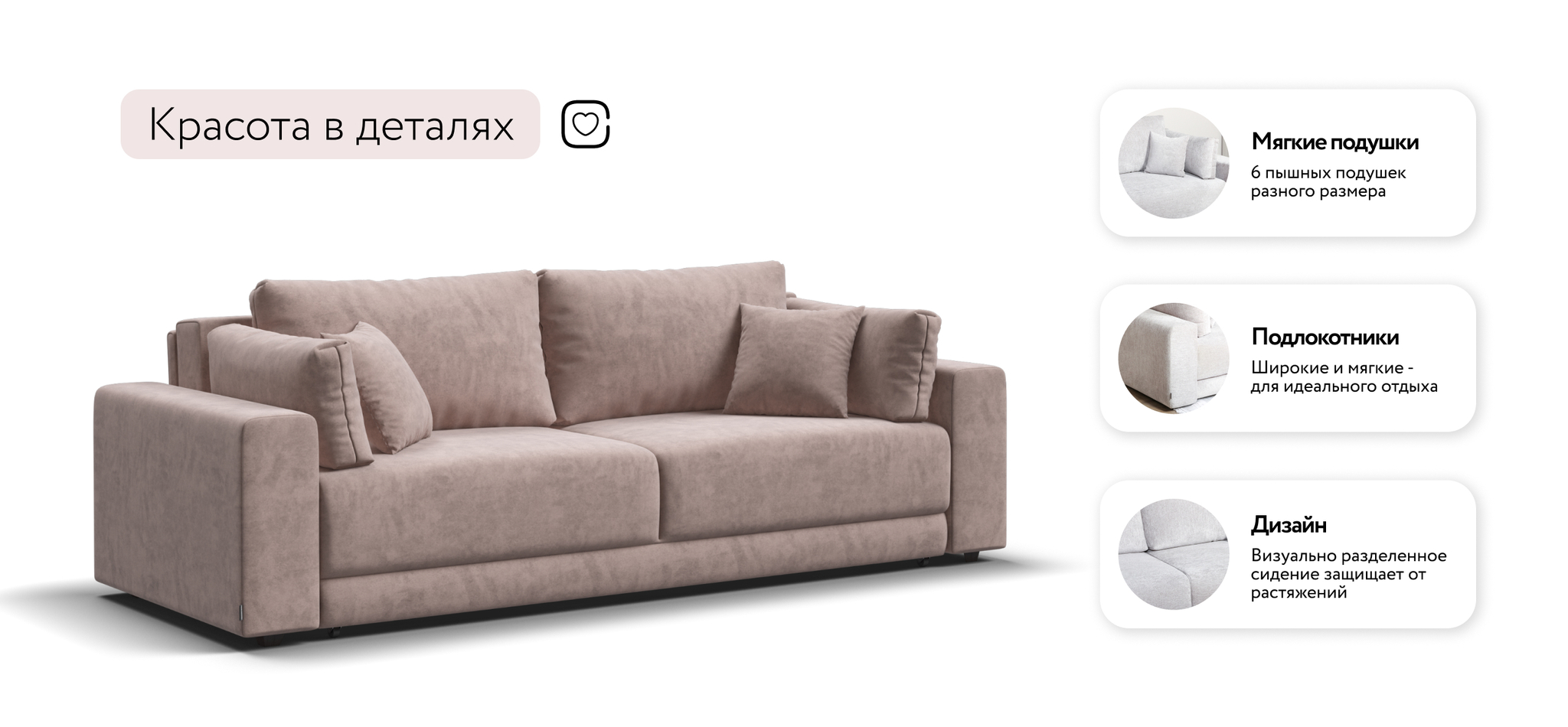 Босс Прайм — это сочетание современного дизайна и продуманной эргономики, создающее уютную атмосферу в любом интерьере. Визуально разделённое сиденье, широкие мягкие подлокотники и пышные подушки разного размера обеспечивают не только эстетическую привлекательность, но и максимальный комфорт.Оснащённый независимым пружинным блоком и высокоэластичной пеной Эластик Фоам с дополнительным слоем периотека, диван гарантирует анатомическую поддержку и комфортный сон. Простой и надёжный механизм трансформации «еврокнижка» позволяет легко преобразовать диван в просторное спальное место.