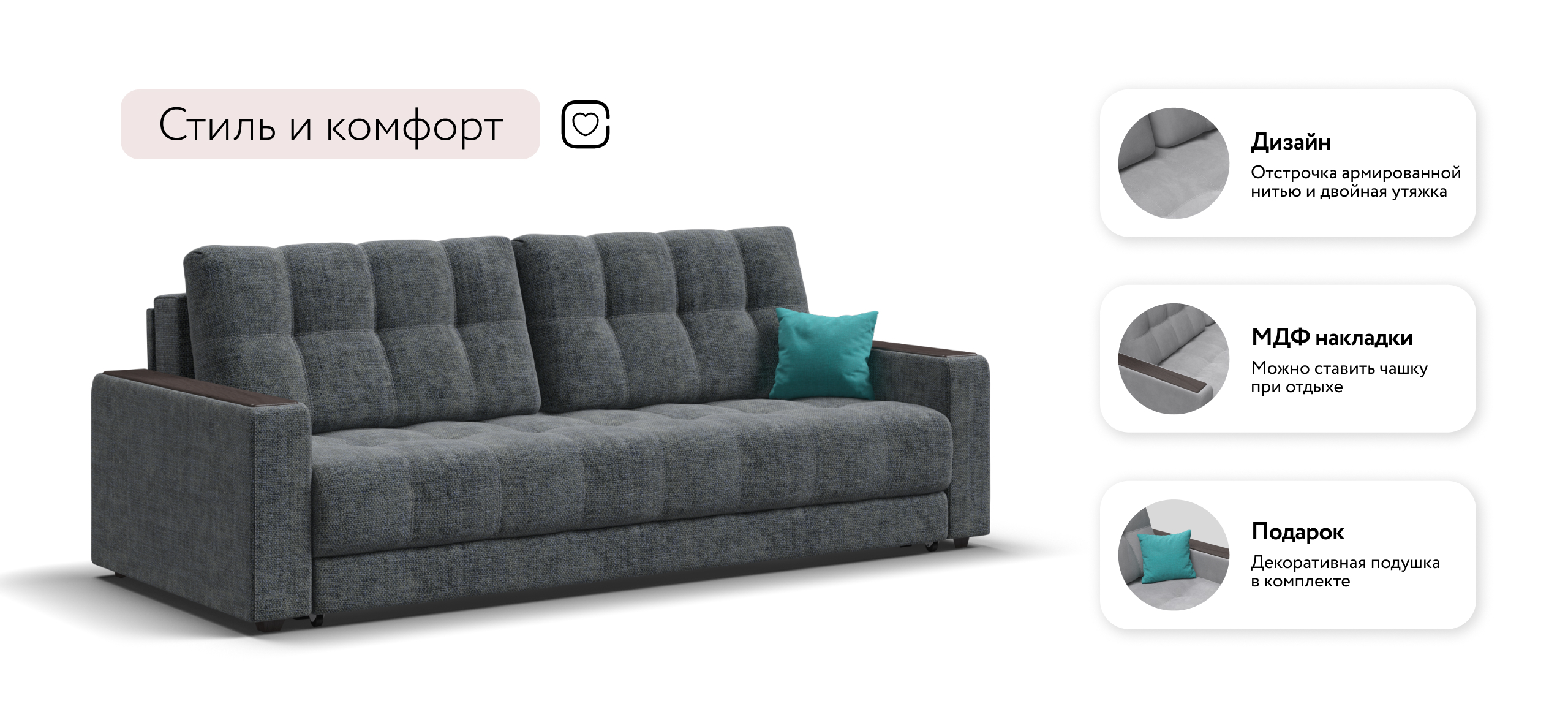 Благодаря дополнительному пуфу, который Вы можете приобрести к нему отдельно, прямой диван с легкостью становится полноценным угловым диваном.