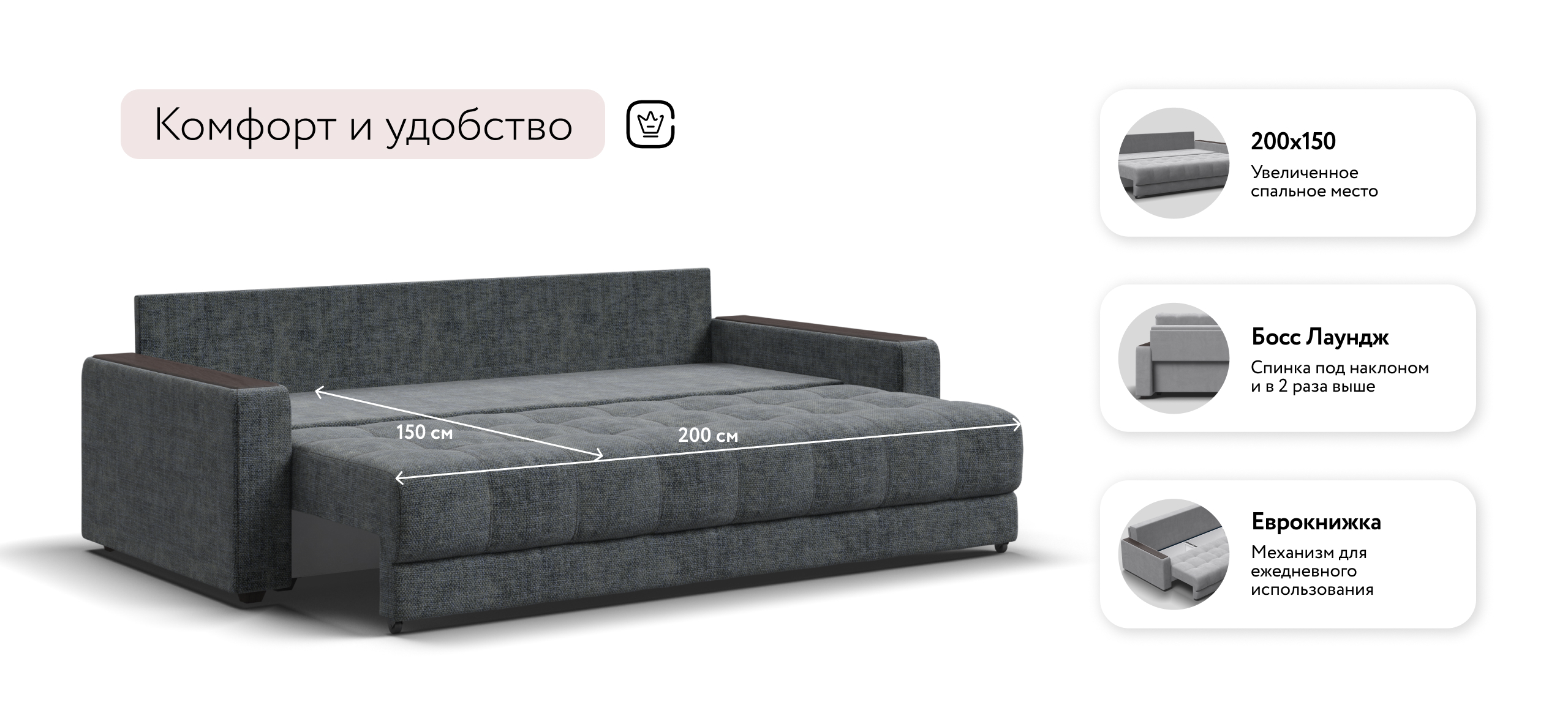 Стильный диван для тех, кто ищет максимальный комфорт. Продуманный до мелочей диван БОСС сочетает в себе надежный каркас, мягкие ткани, многофункциональность и быструю сборку за 1 минуту без инструментов - ощутите комфорт у себя дома!