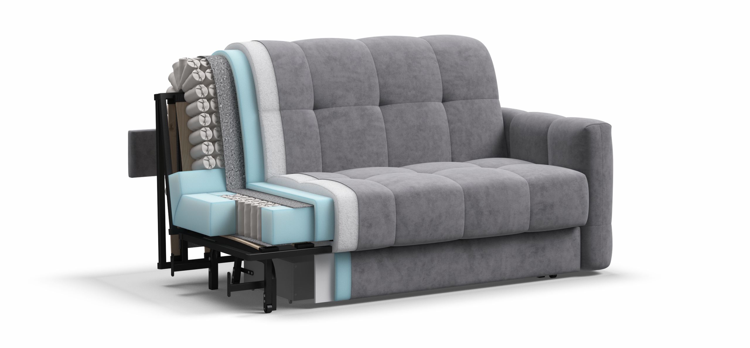 Инновационный анатомический матрас в диване, высотой 15 см., выполнен из полноценного независимого пружинного блока Босс Фит и высокоэластичной пены  Флекс – гарантия здорового сна, как на кровати!