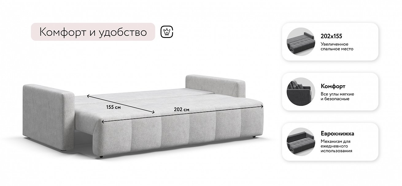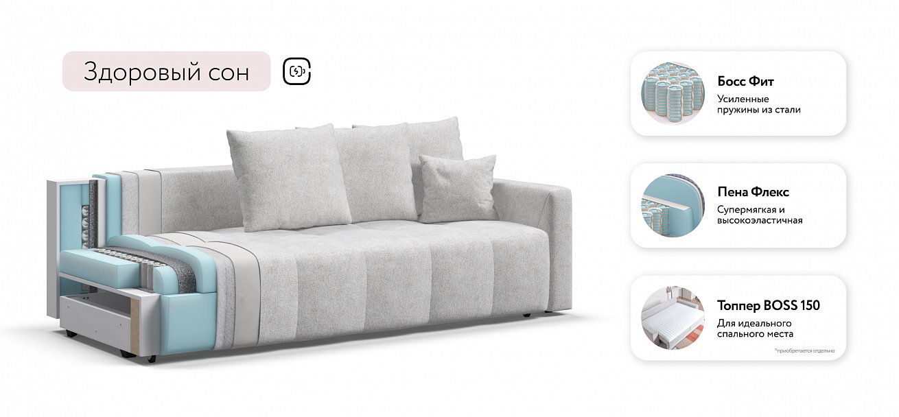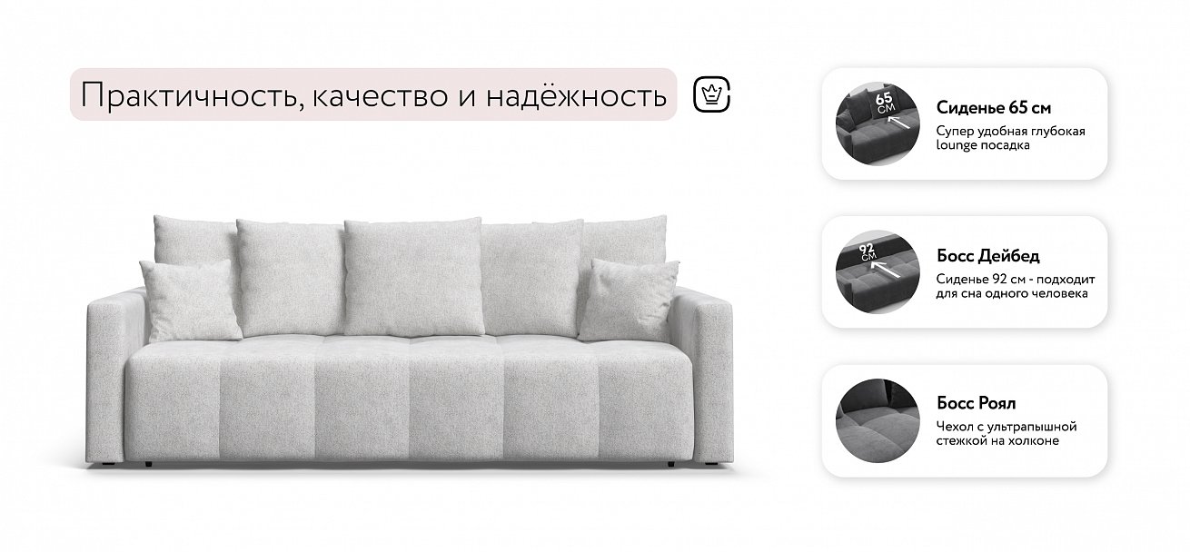 Сиденье Босс Дейбед глубиной 92 см идеально подходит для сна одного человека, даже без раскладывания дивана. Независимый пружинный блок в основании и механизм "еврокнижка" превращают диван в комфортное спальное место с анатомическим эффектом.