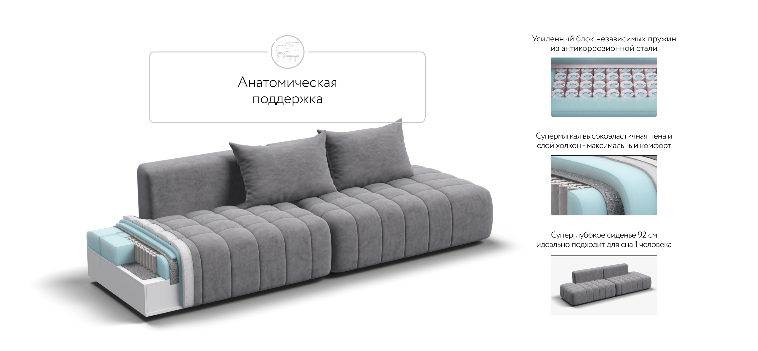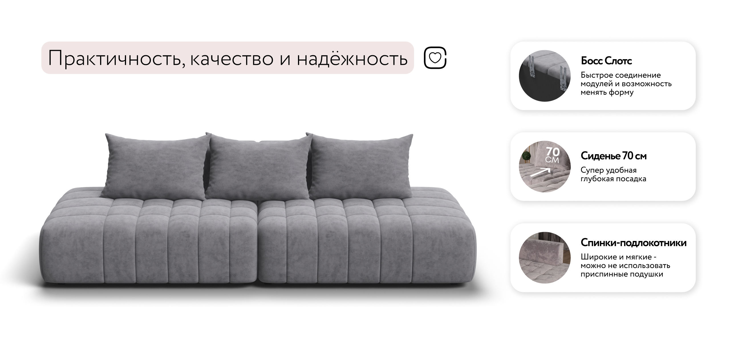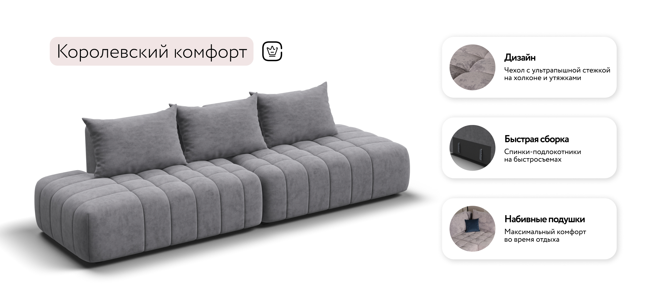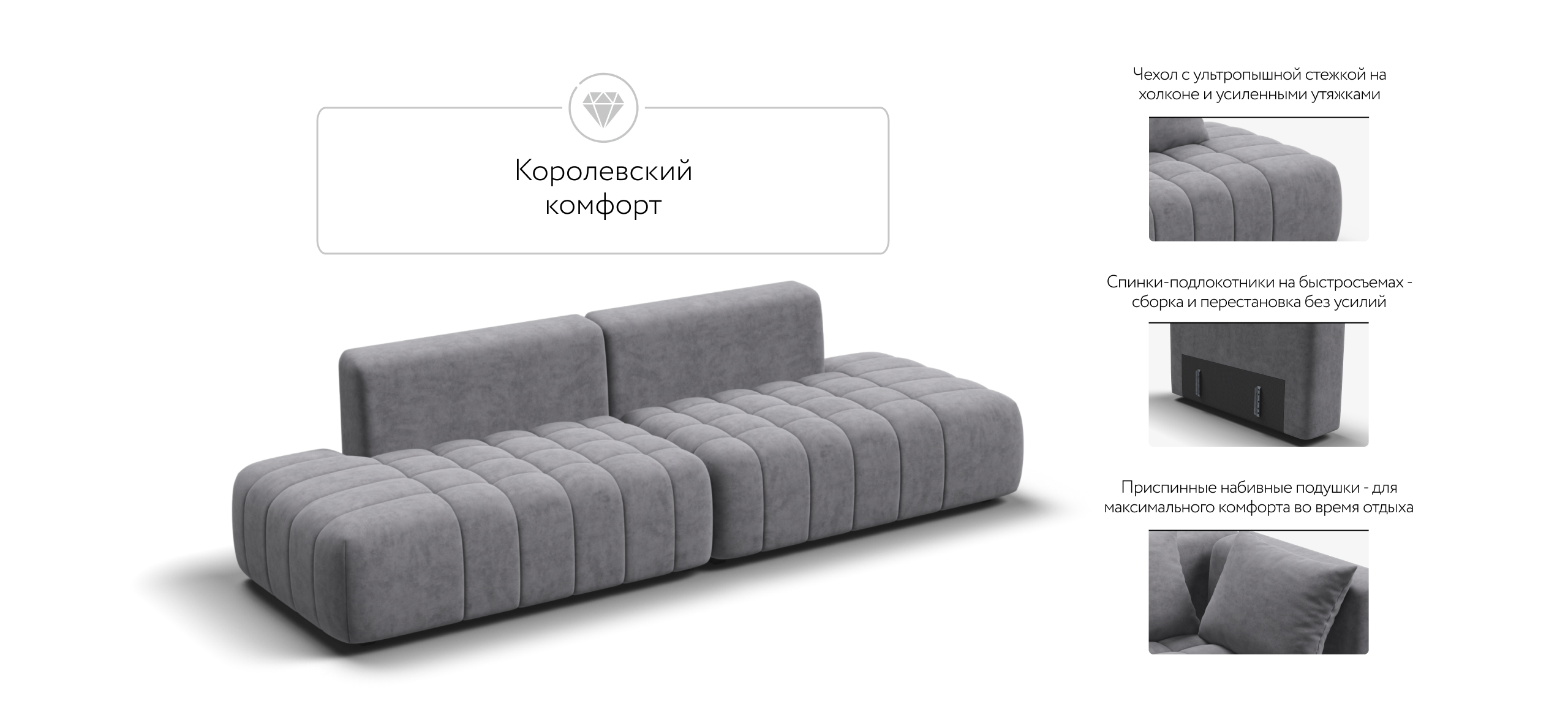 Босс Твин – мягкий и утянутый со всех сторон диван, создаст дополнительный уют и станет сердцем вашего дома.Универсальный дизайн 3-в-1 позволяет быстро менять его форму — левый угол, правый угол и прямой — всё для Вашего комфорта.Благодаря инновационной системе креплений и быстросъёмным элементам Вы с лёгкостью можете поменять конфигурацию и адаптировать диван под новое пространство.Премиальный чехол с ультрапышной стежкой и усиленной фиксацией добавляет элегантности и защищает от износа. Глубокое сиденье и независимые пружины в основании словно созданы для полного расслабления, а мягкие спинки обеспечивают комфорт без лишних подушек.Босс Твин – это не просто мебель, это уют и стиль, которые будут радовать каждый день.