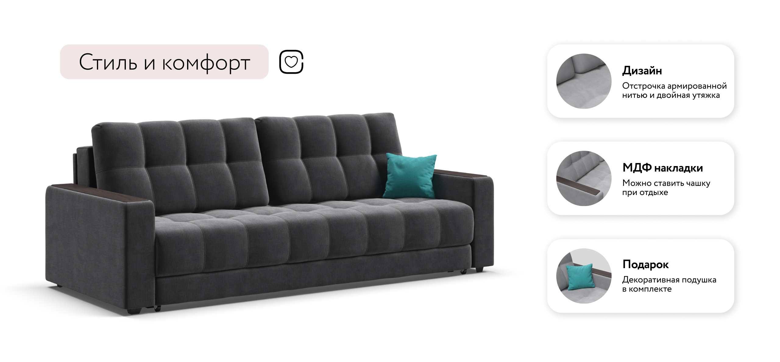 Стильный диван для тех, кто ищет максимальный комфорт. Продуманный до мелочей диван Босс сочетает в себе надежный каркас, мягкие ткани, многофункциональность и быструю сборку за 1 минуту без инструментов - ощутите комфорт у себя дома!