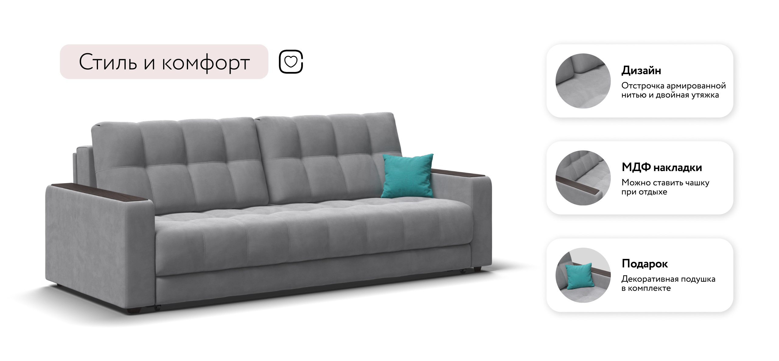 Благодаря дополнительному пуфу, который Вы можете приобрести к нему отдельно, прямой диван с легкостью становится полноценным угловым диваном.