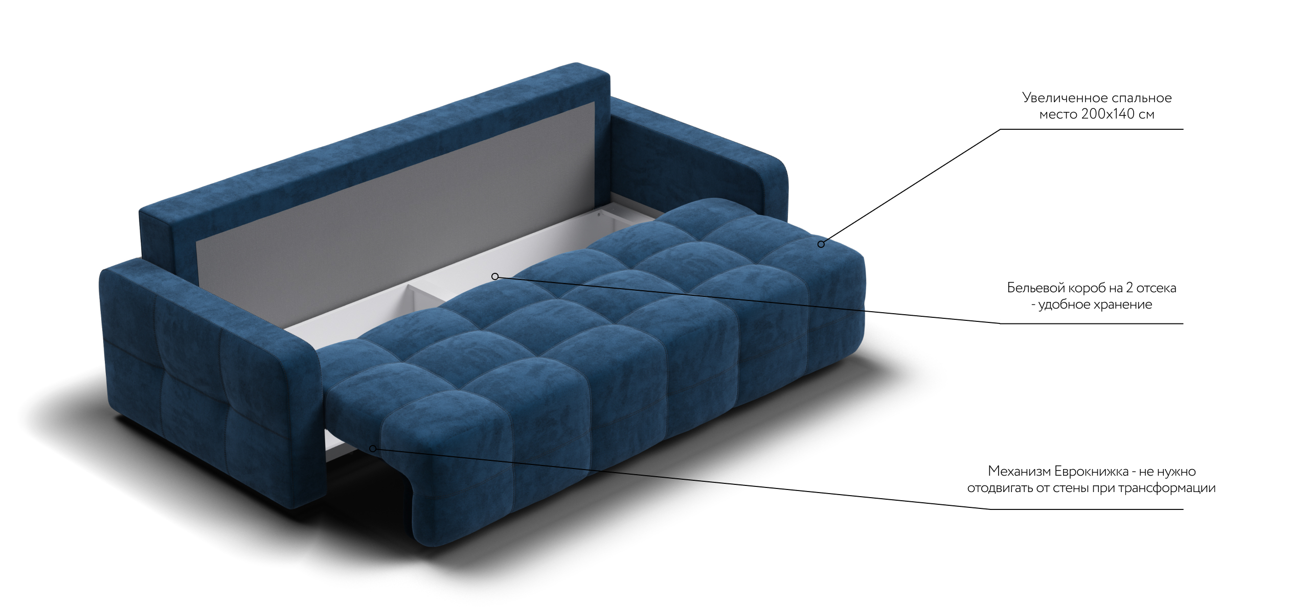 Диван Денди - с ним так легко создать настоящий уют и домашний комфорт. Мягкие приспинные подушки и независимый пружинный блок в основании обеспечат максимальный комфорт во время отдыха. Простой и надежный механизм трансформации еврокнижка позволяет с легкостью раскладывать диван в удобную, полноценную, двуспальную кровать с идеально ровным спальным местом.