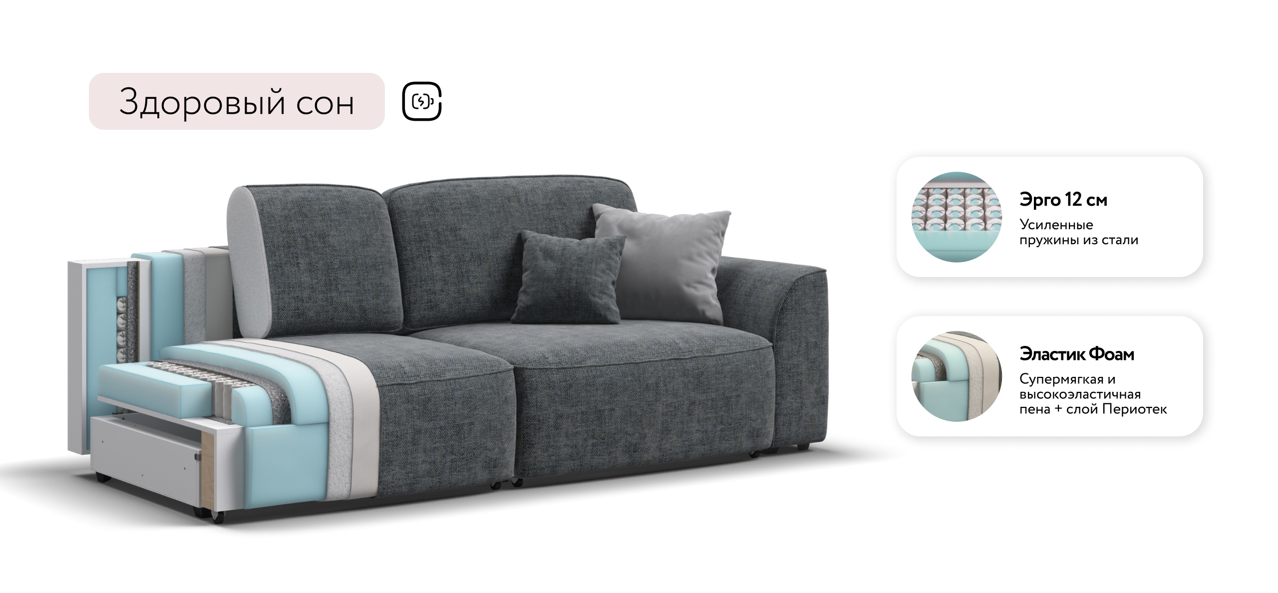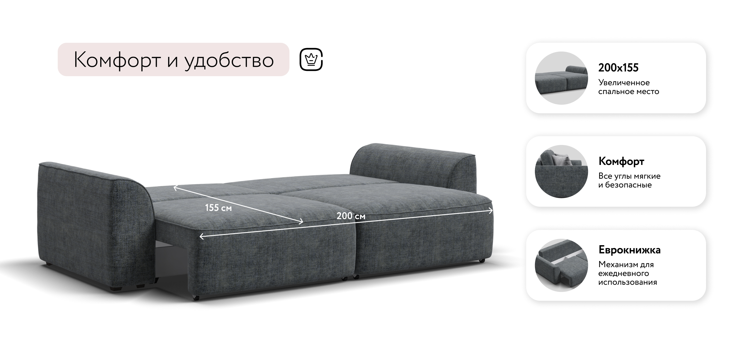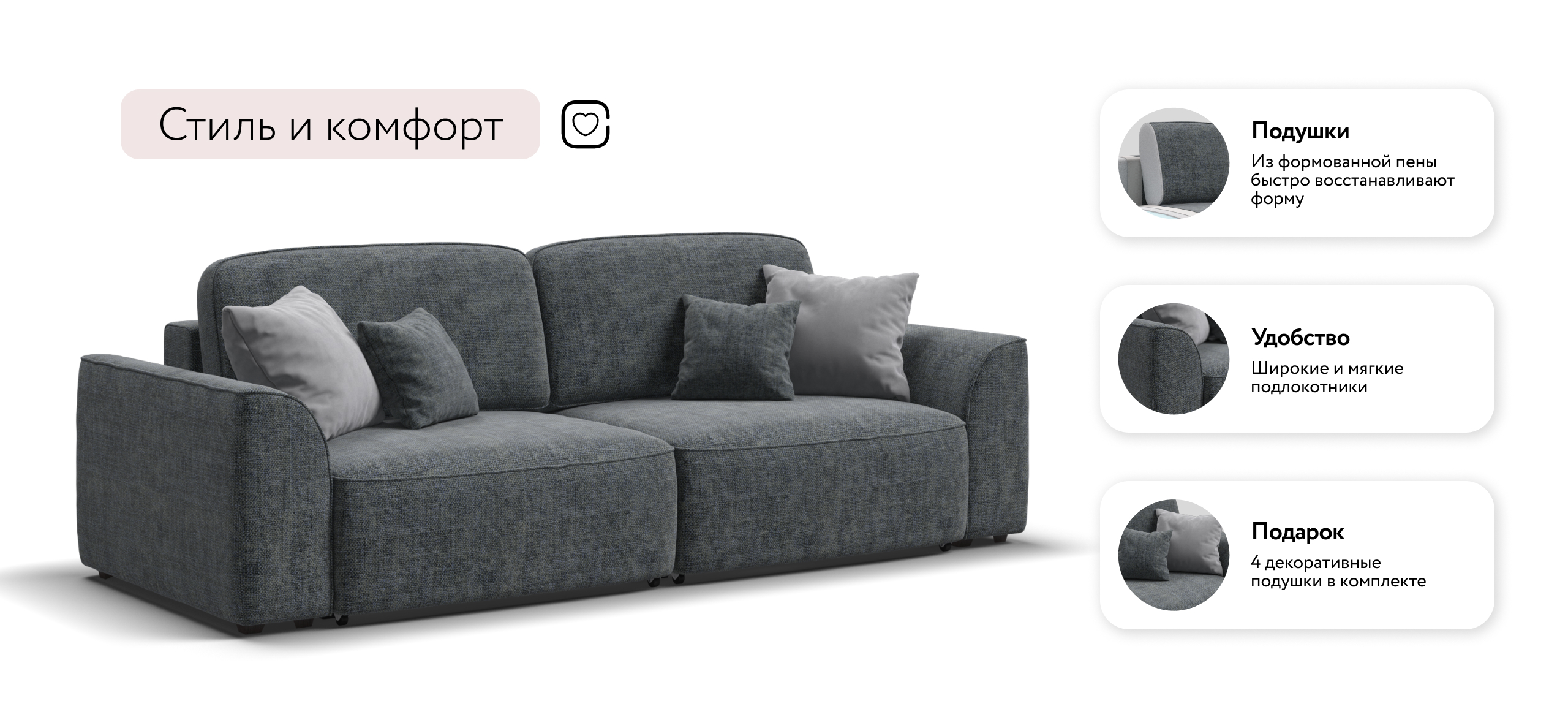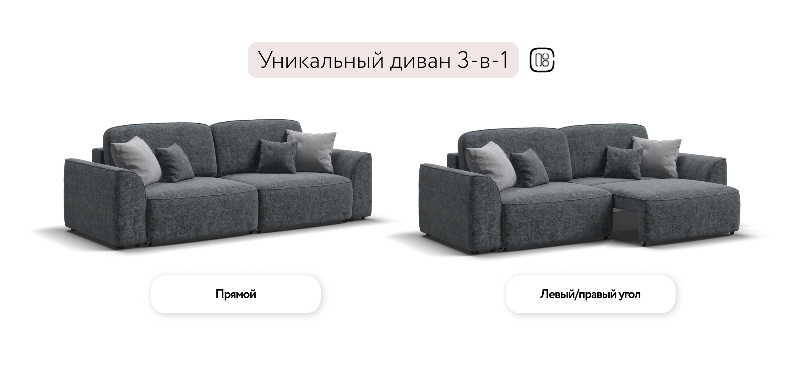 Комфортная посадка, скругленные линии, объемные подушки - диван, который наполнит ваш дом уютом и комфортом. Каждое посадочное место можно выдвинуть вперед и получить угловой диван, на котором с комфортом разместится небольшая компания. А в разложенном виде диван превращается в комфортное спальное место.
