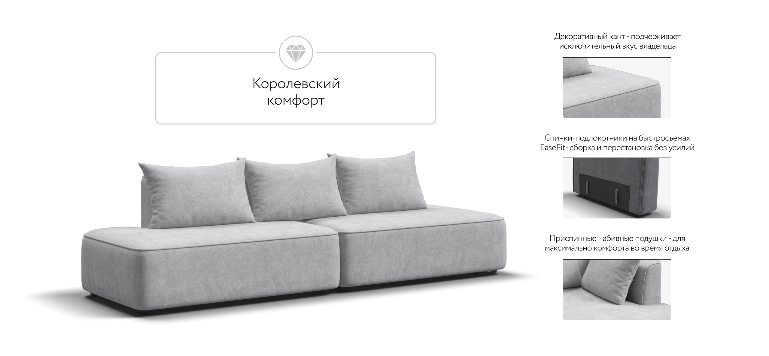 Благодаря инновационной системе креплений и быстросъёмным элементам Вы с лёгкостью можете поменять конфигурацию и адаптировать диван под новое пространство.