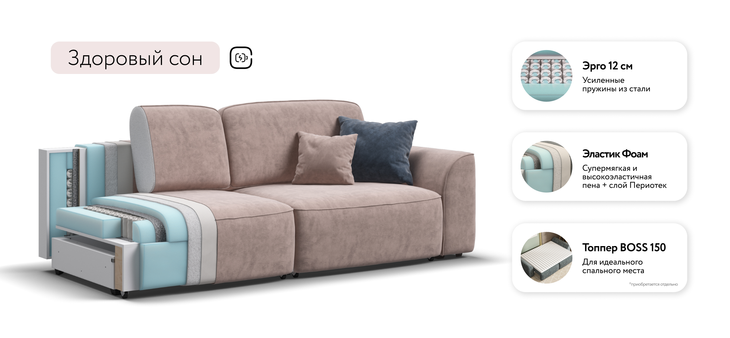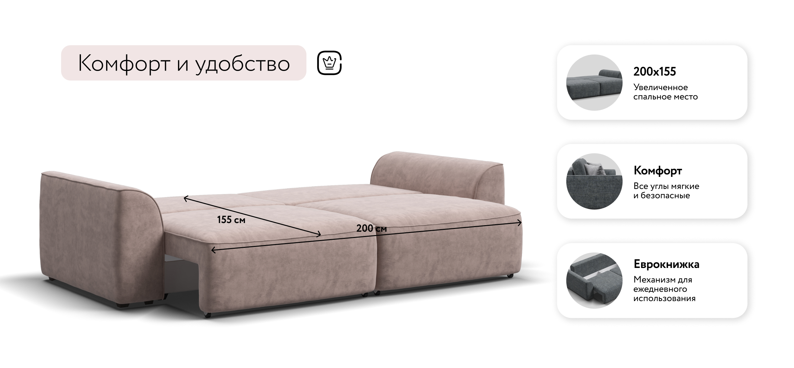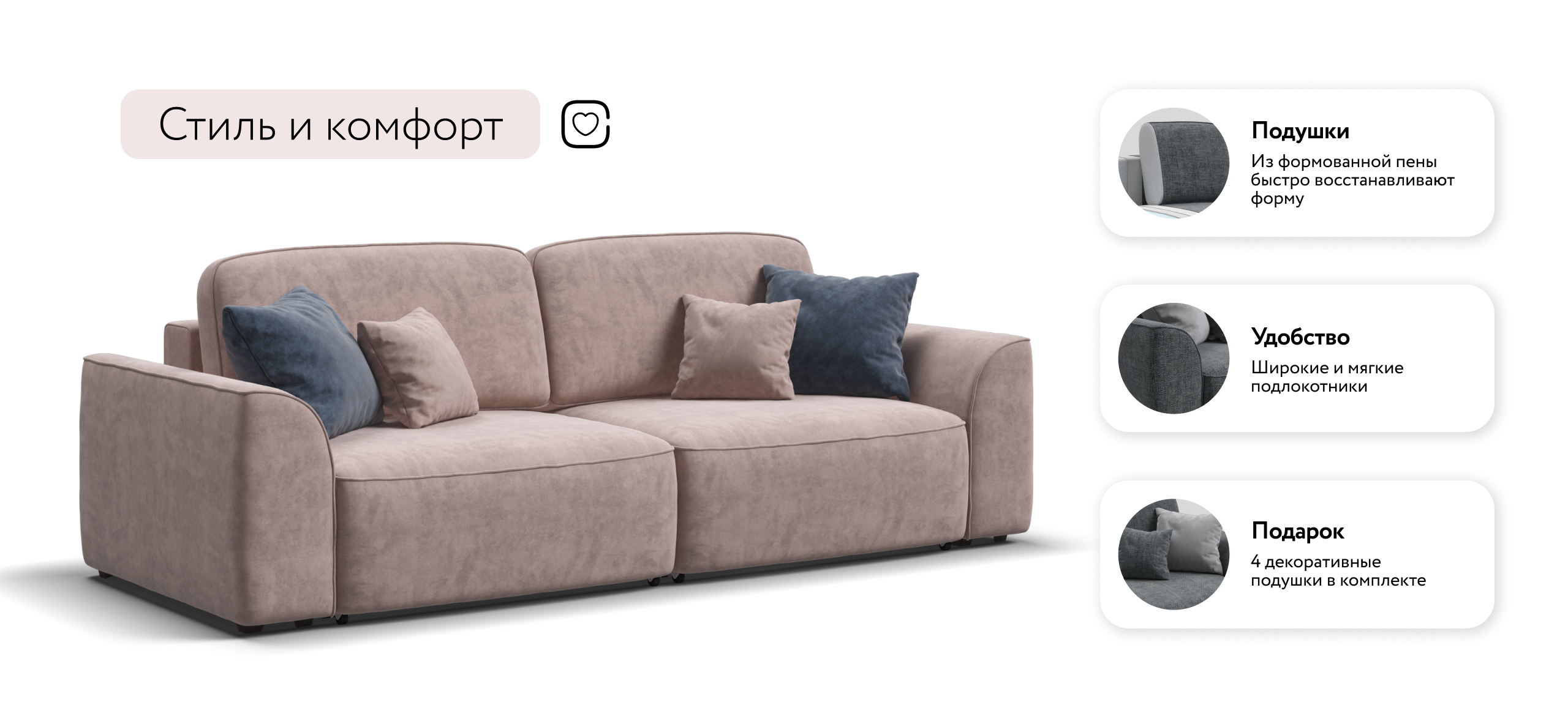 Комфортная посадка, скругленные линии, объемные подушки - диван, который наполнит ваш дом уютом и комфортом. Каждое посадочное место можно выдвинуть вперед и получить угловой диван, на котором с комфортом разместится небольшая компания. А в разложенном виде диван превращается в комфортное спальное место.