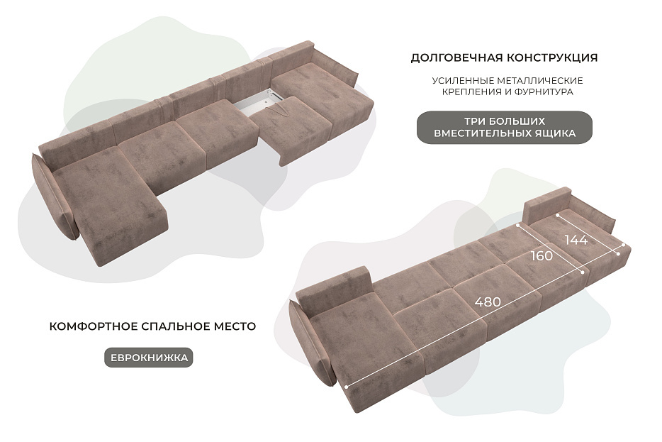 Большой размерПри габаритах: 420x96x170 см подойдет для просторных комнат для большой семьи или вечеров в компании, легко раскладывается, обеспечивая 2 спальных места размером 144x240 см каждое.