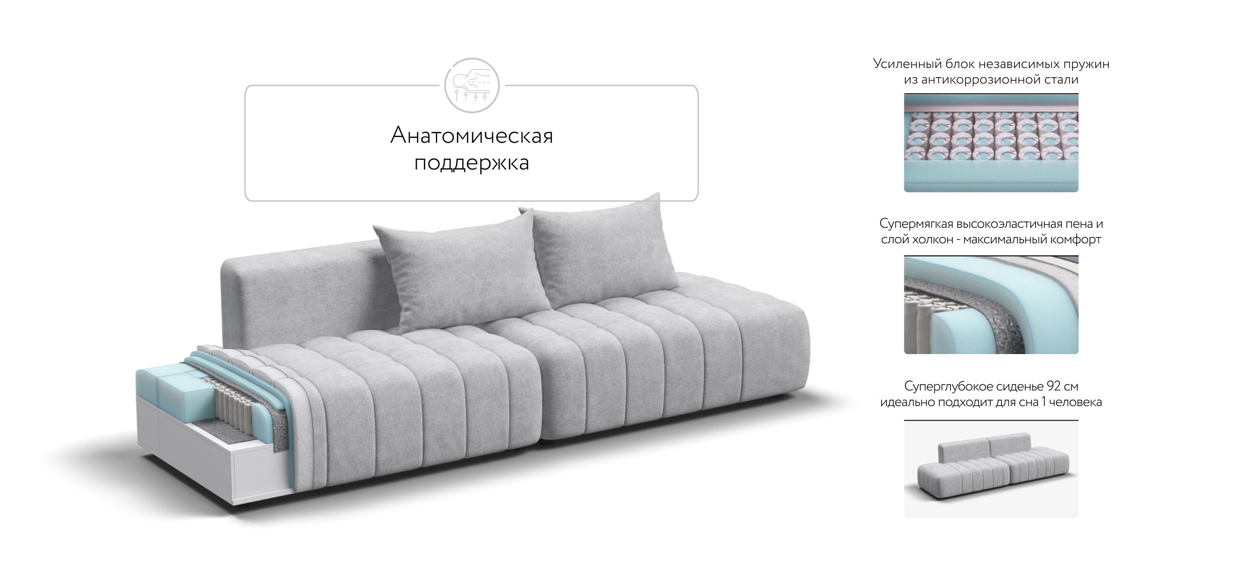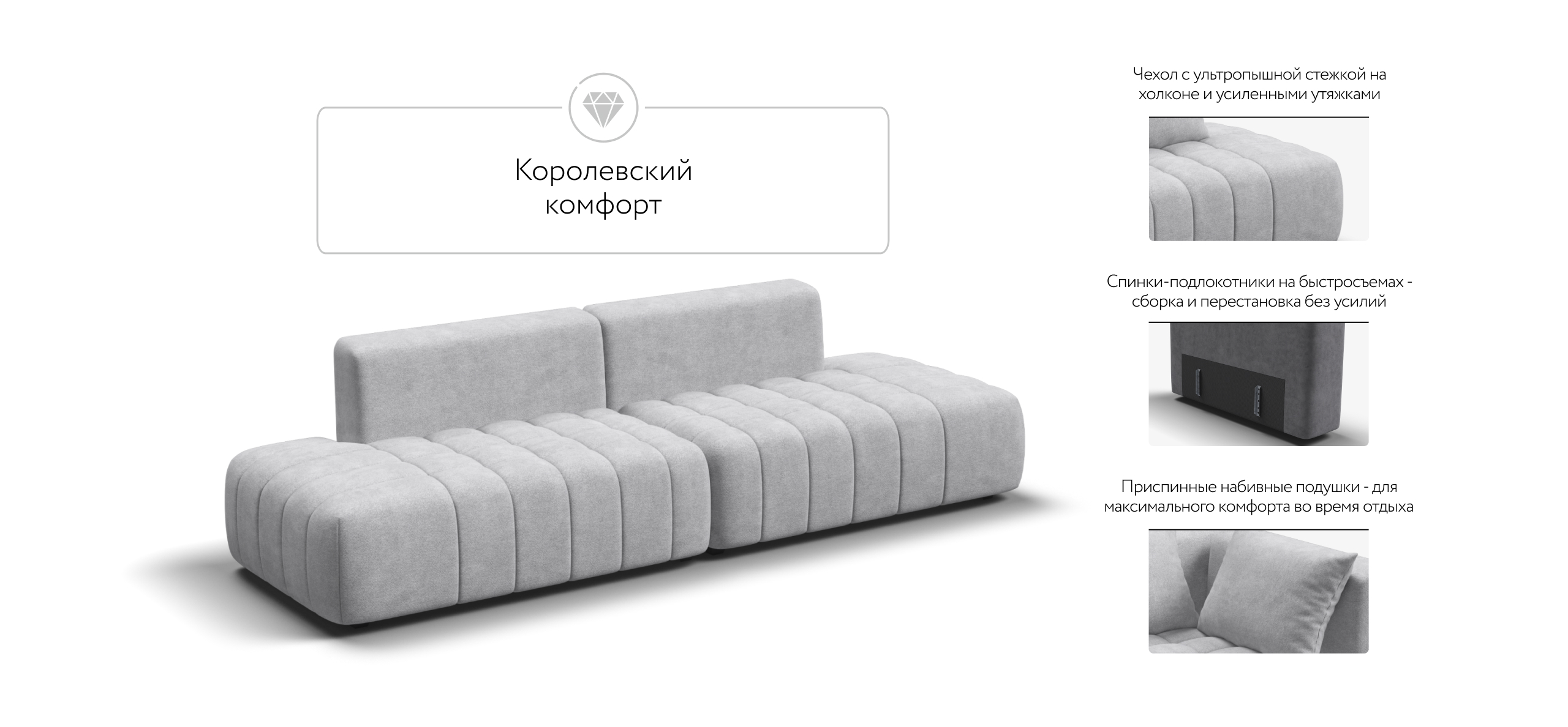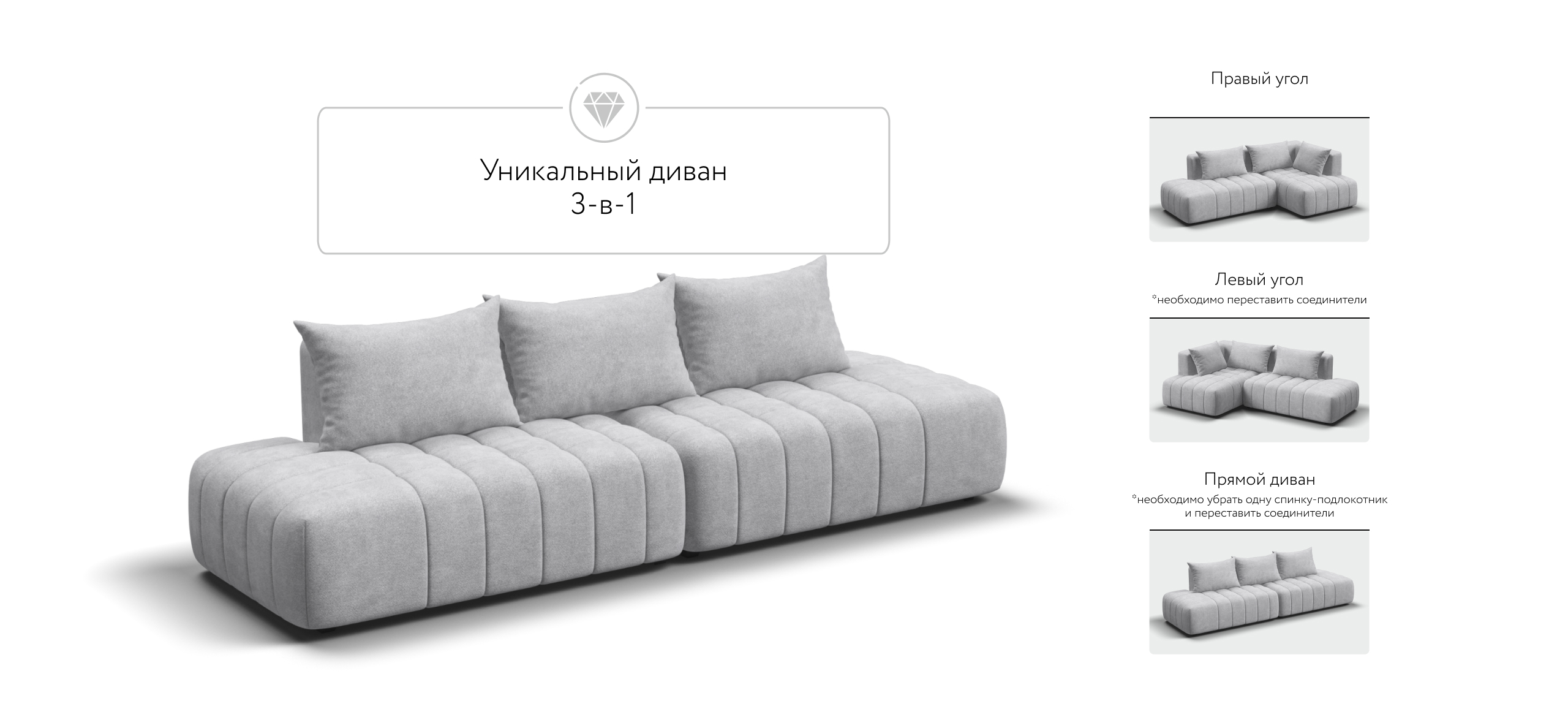 Босс Твин – мягкий и утянутый со всех сторон диван, создаст дополнительный уют и станет сердцем вашего дома.Универсальный дизайн 3-в-1 позволяет быстро менять его форму — левый угол, правый угол и прямой — всё для Вашего комфорта.Благодаря инновационной системе креплений и быстросъёмным элементам Вы с лёгкостью можете поменять конфигурацию и адаптировать диван под новое пространство.Премиальный чехол с ультрапышной стежкой и усиленной фиксацией добавляет элегантности и защищает от износа. Глубокое сиденье и независимые пружины в основании словно созданы для полного расслабления, а мягкие спинки обеспечивают комфорт без лишних подушек.Босс Твин – это не просто мебель, это уют и стиль, которые будут радовать каждый день.