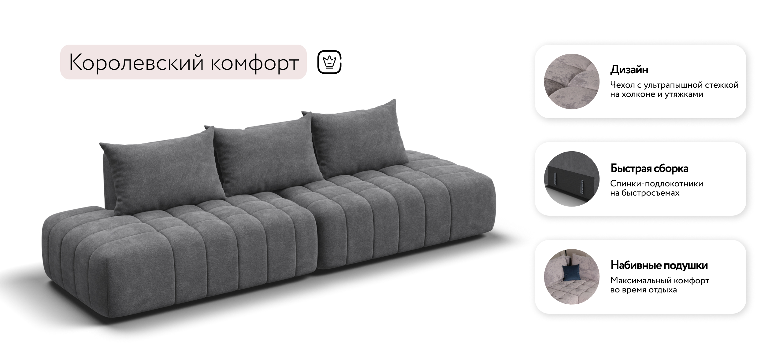 Премиальный чехол с ультрапышной стежкой и усиленной фиксацией добавляет элегантности и защищает от износа. Глубокое сиденье и независимые пружины в основании словно созданы для полного расслабления, а мягкие спинки обеспечивают комфорт без лишних подушек.Босс Твин – это не просто мебель, это уют и стиль, которые будут радовать каждый день.