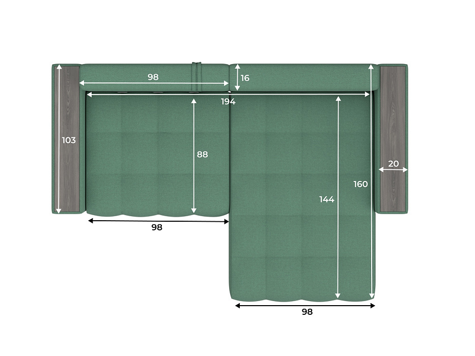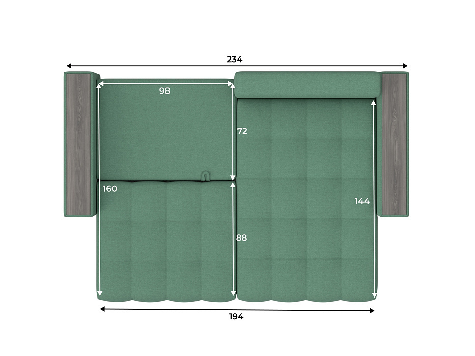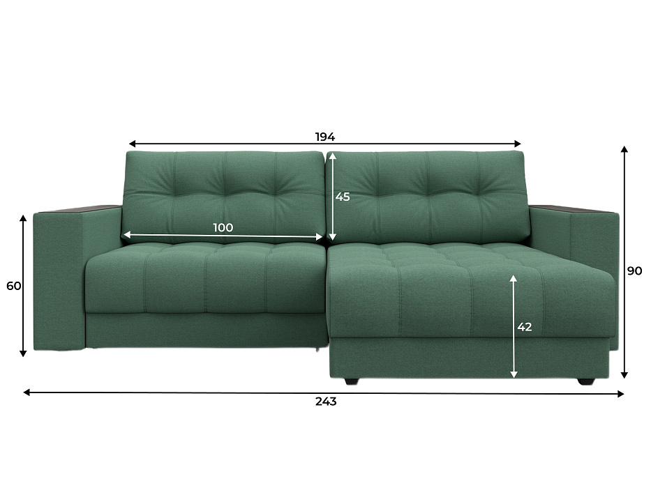 При габаритах: 234x90x158 см подойдет для комнат любых размеров, легко раскладывается, обеспечивая спальное место 143x192 см. Угол дивана универсальный, можно собрать с левым или с правым углом.