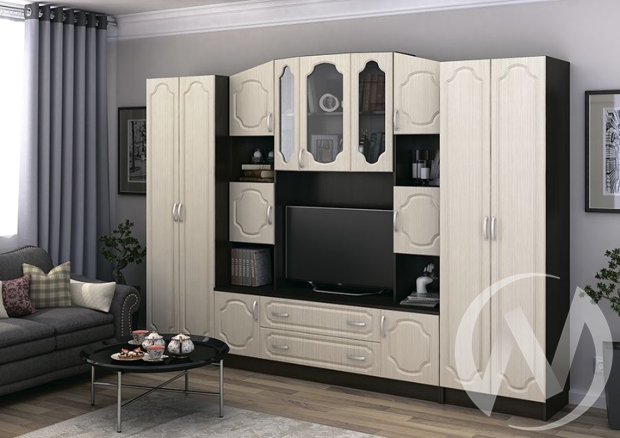 Гостиная "Макарена" – бюджетный вариант классической гостиной. При всей простоте комплектации, гостиная многофункциональна и практична для любого интерьера. Удачная цветовая комбинация поможет визуально добавить света в комнату. Модель больше подойдёт для просторного помещения, где достаточное количество места для рационального расположения мебели. Высокие шкафы для хранения одежды очень вместительны, а центральная секция стандартно имеет свободное пространство под телевизор. Просторные выдвижные ящики доступны и удобны в использовании. Верхнюю часть гостиной занимают шкафы с застеклёнными фасадами, что придаёт шарм общему виду модели.