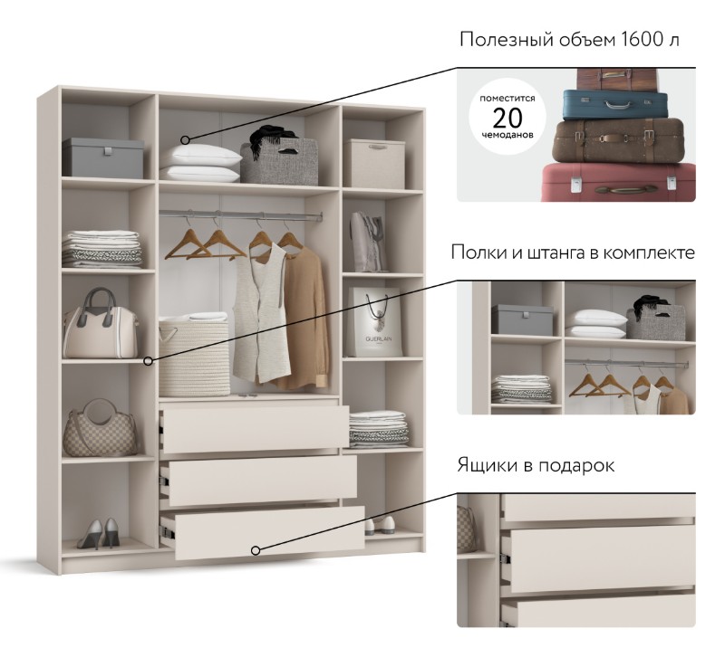 Когда руки заняты — лёгкое касание, и дверь мягко поддаётся. Внутри — ясная логика хранения: блок выдвижных ящиков работает как «мини-комод», помогает быстро разложить бельё и мелочи, а основной объём уверенно берёт на себя содержимое 20 крупных чемоданов — гардероб, обувные коробки, постельное.