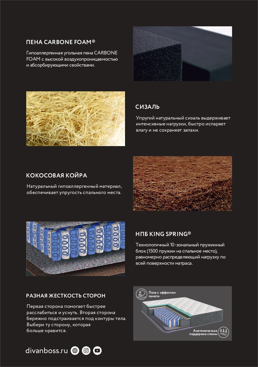 ППУ MEMORIX, ППУ CARBONE FOAM, Сизаль, Термовойлок, НПБ KING SPRING, Латексированная кокоcовая койра, Латекс с экстрактом лаванда, Велюр, трикотаж класса PREMIUM
