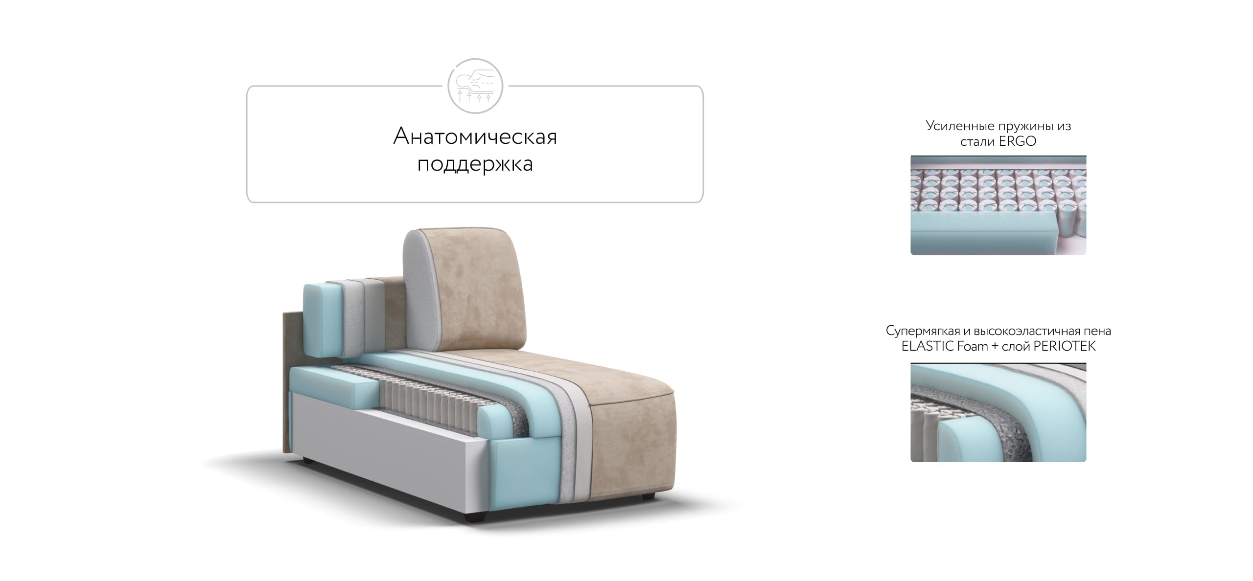 с дополнительным слоем Периотек создадут максимальный комфорт во время отдыха. Благодаря глубокой посадке шезлонга 110см, можно отдыхать полулежа не раскладывая диван