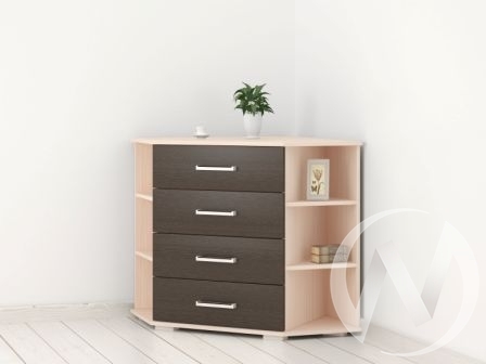 Комод «Катрин-7». Угловая модель комода «Катрин-7» позволит вам освободить достаточное количество места и рационально распорядиться свободным пространством жилой зоны. Комод имеет 4 просторных выдвижных ящика посередине, и открытые полки по краям модели, которые вы сможете оформить декоративными элементами интерьера, гармонично дополняющие общий стиль комнаты. Цветовое решение дуб молочный/венге отлично подойдёт для интерьера в сдержанном классическом стиле, а дуб сонома/ясень шимо-вариант для комнаты в благородном стиле модерн.