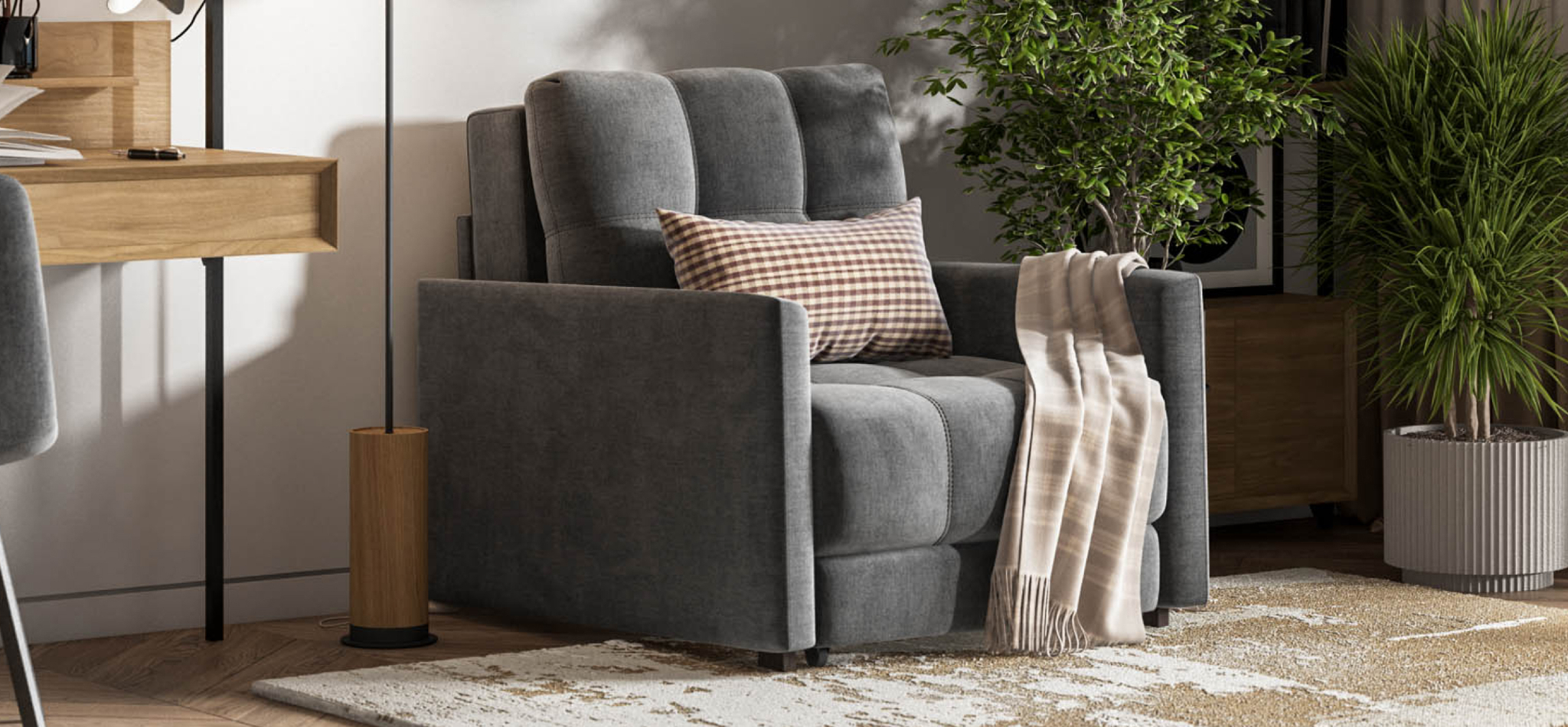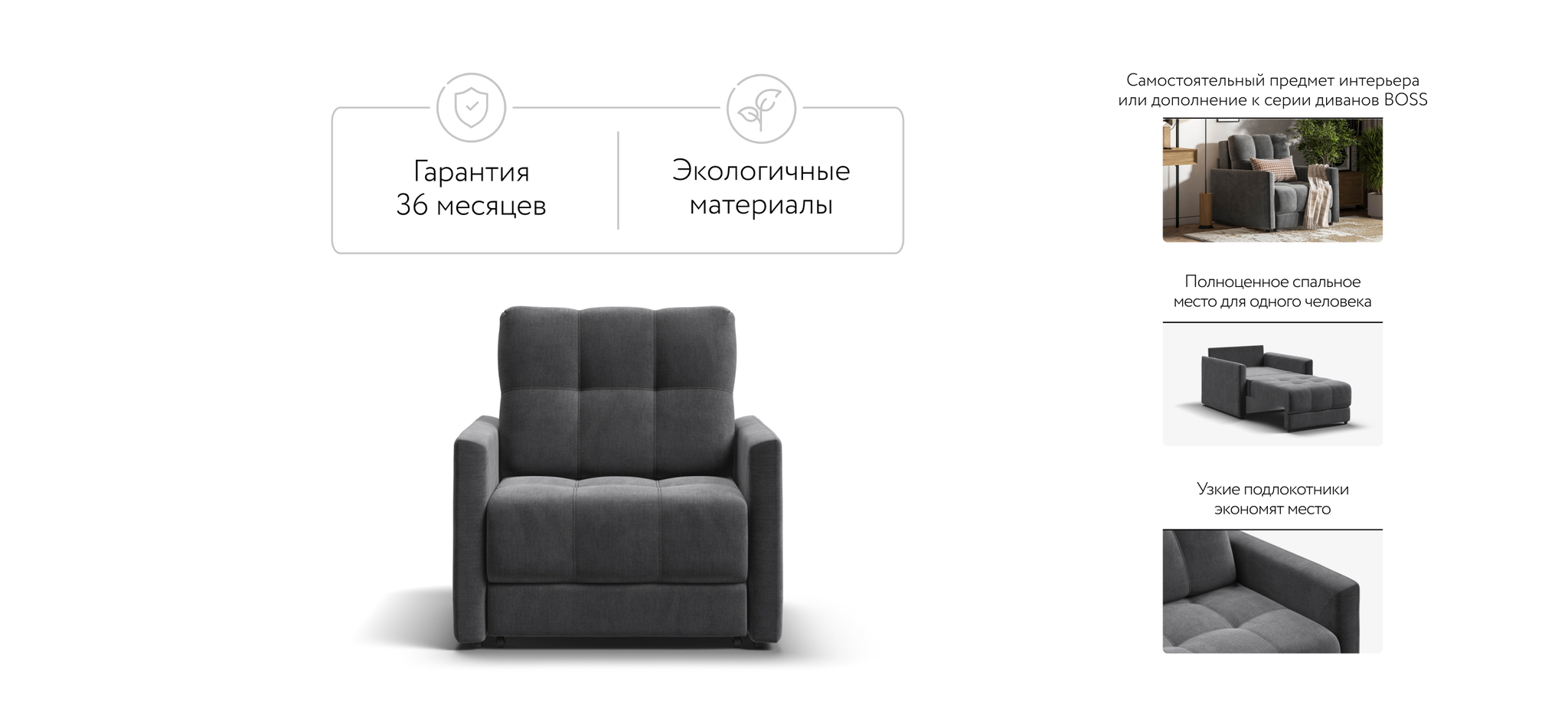 БОСС ЛОФТ кресло-кровать - идеальное дополнение к дивану БОСС ЛОФТ, отлично сочетает в себе две функции: подарит комфортный отдых днем и даст полноценное спальное место для гостя, который решил остаться у вас на ночь. Тонкие подлокотники идеальны для тех, кто ищет не классическое решение для своего интерьера.Цвет товара на фото может незначительно отличаться по тону от реального из-за особенностей цветопередачи вашего монитора