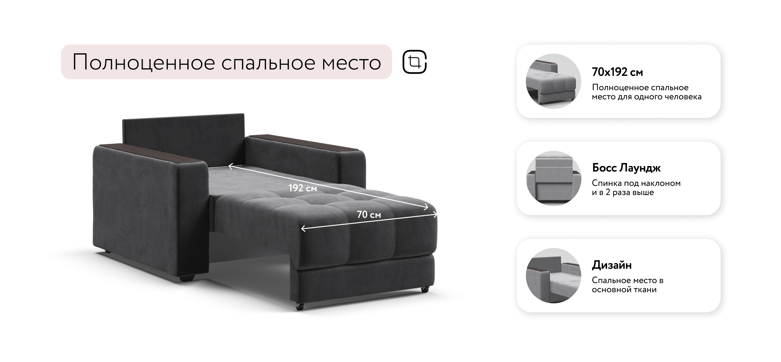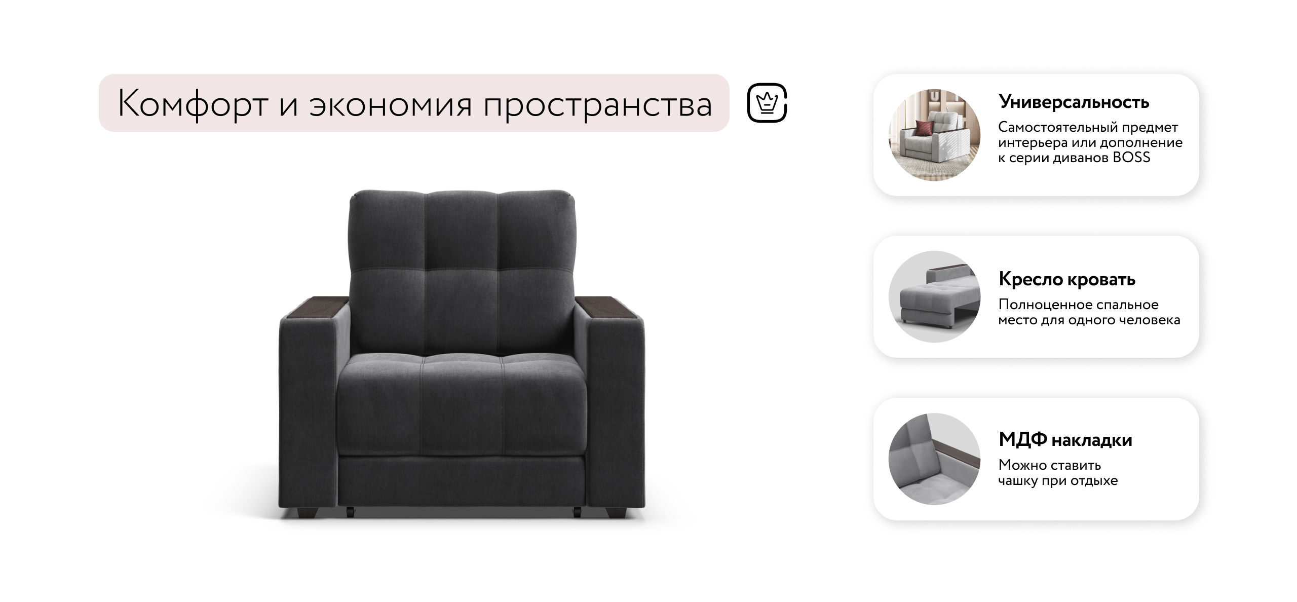 БОСС кресло-кровать – идеальное дополнение к диванам модельного ряда БОСС, отлично сочетает в себе две функции: подарит комфортный отдых днем и даст полноценное спальное место для гостя, который решил остаться у вас на ночь.