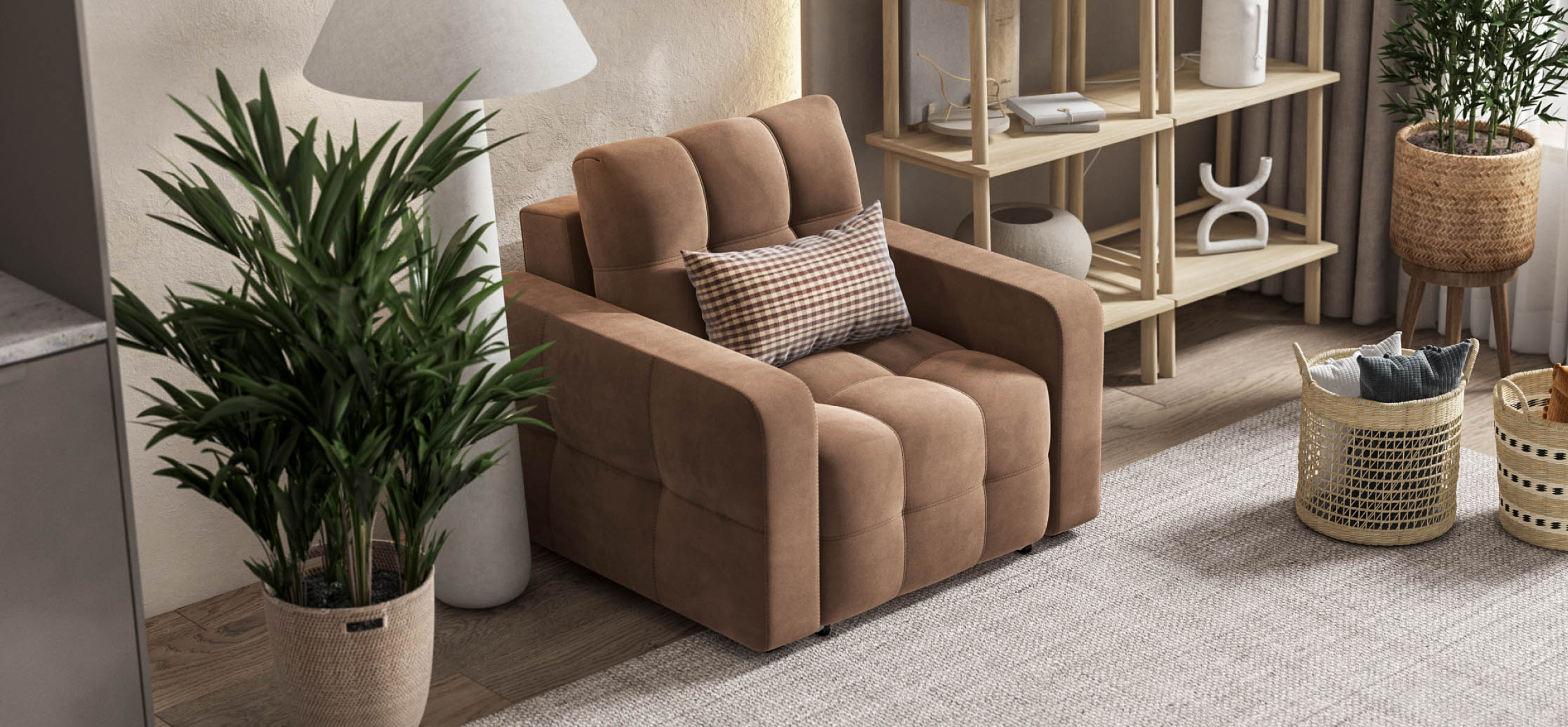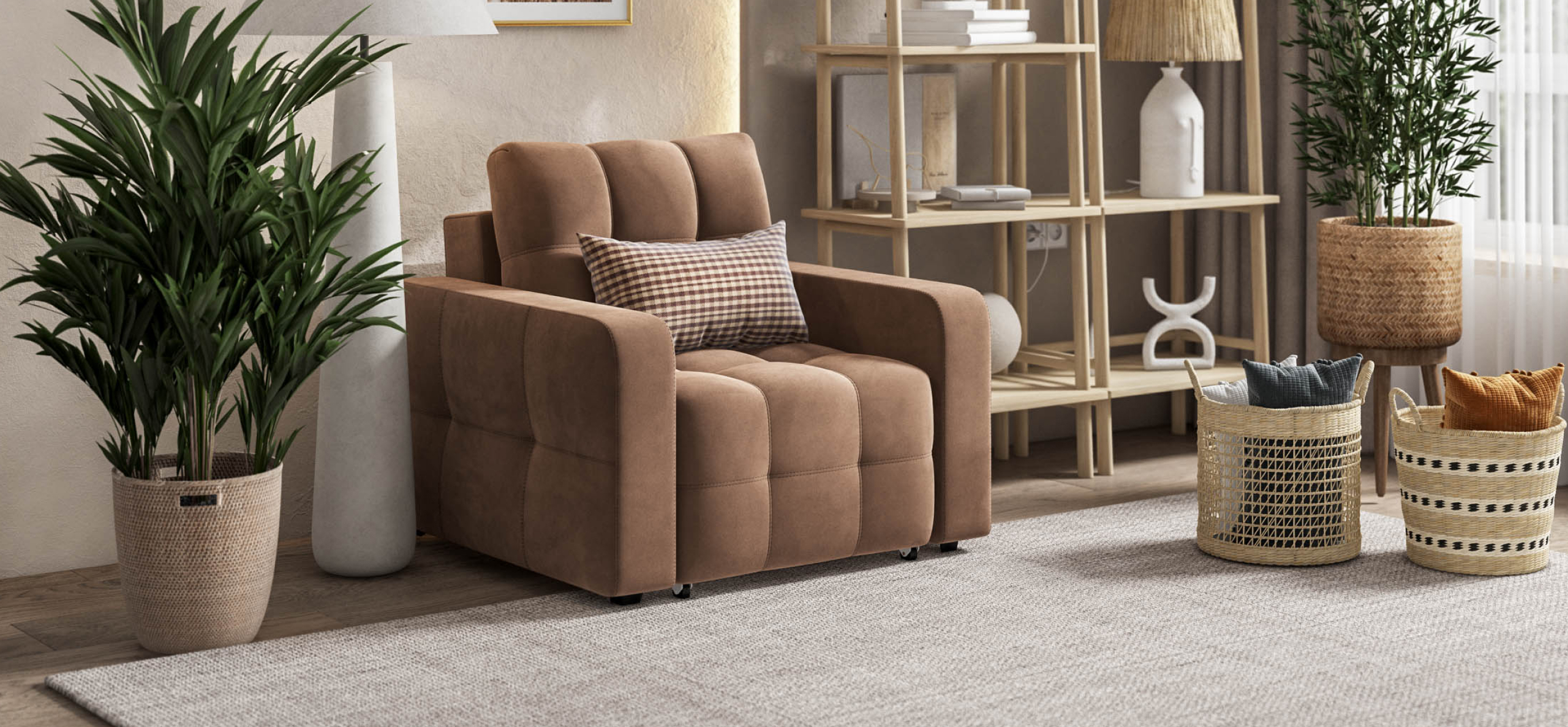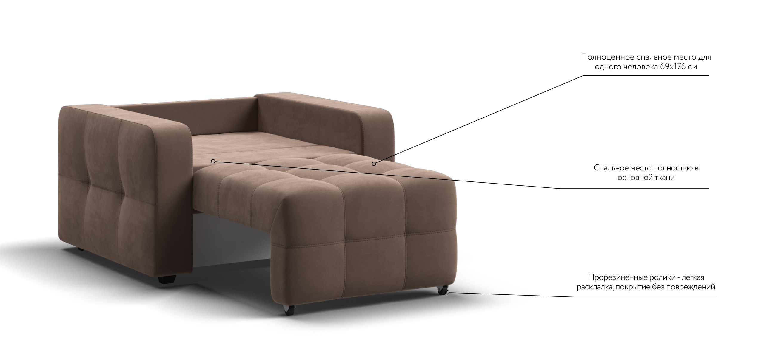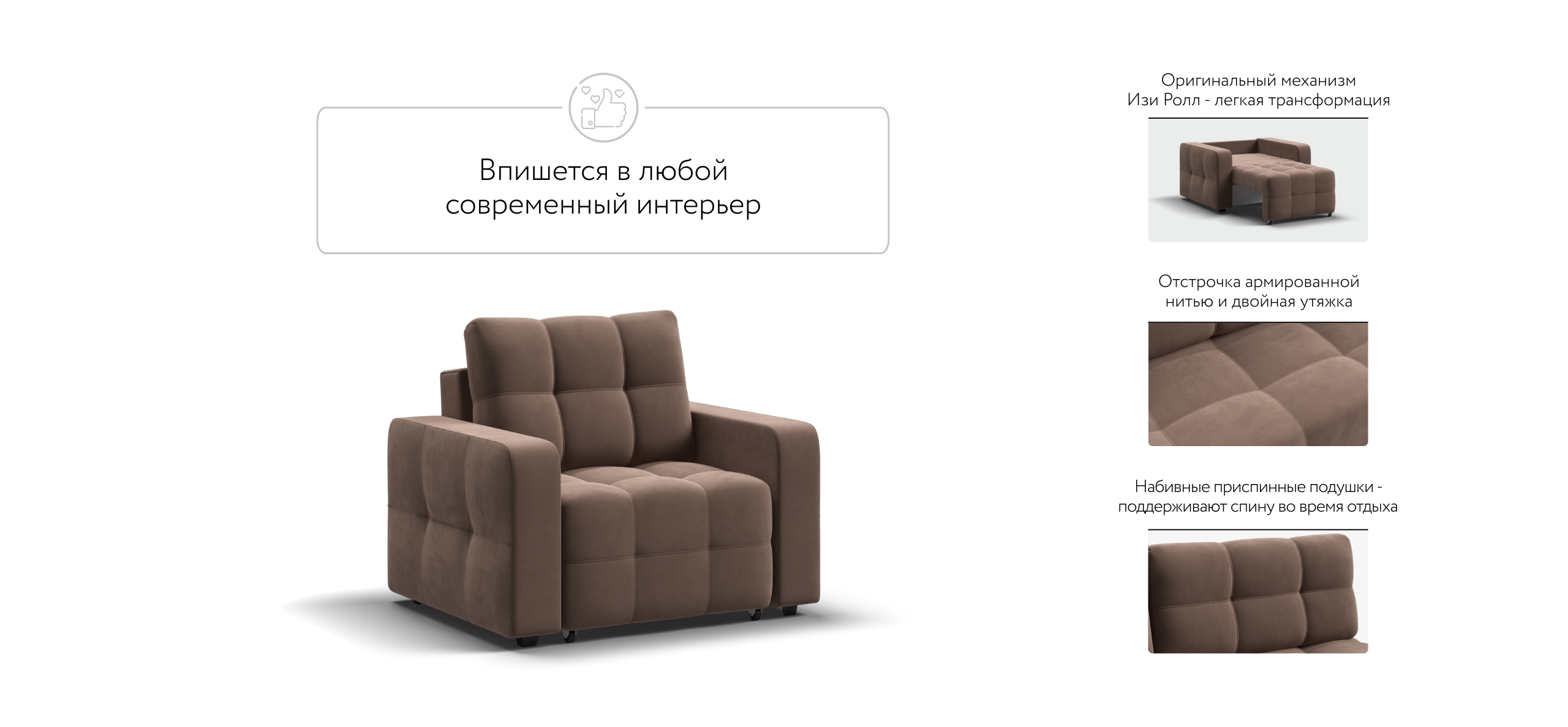 Денди кресло-кровать с механизмом ИЗИ РОЛЛ, которое отлично дополняет линейку диванов Dandy. Легким движением руки кресло раскладывается в удобную кровать.Приспинная планка защищает стены, а также позволяет защитить подушку от падения во время сна. Комфортный матрас 16 см толщиной обеспечивает здоровый сон.