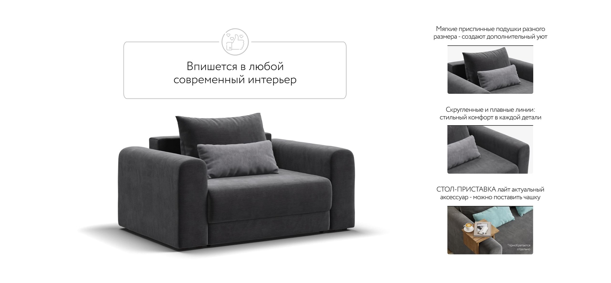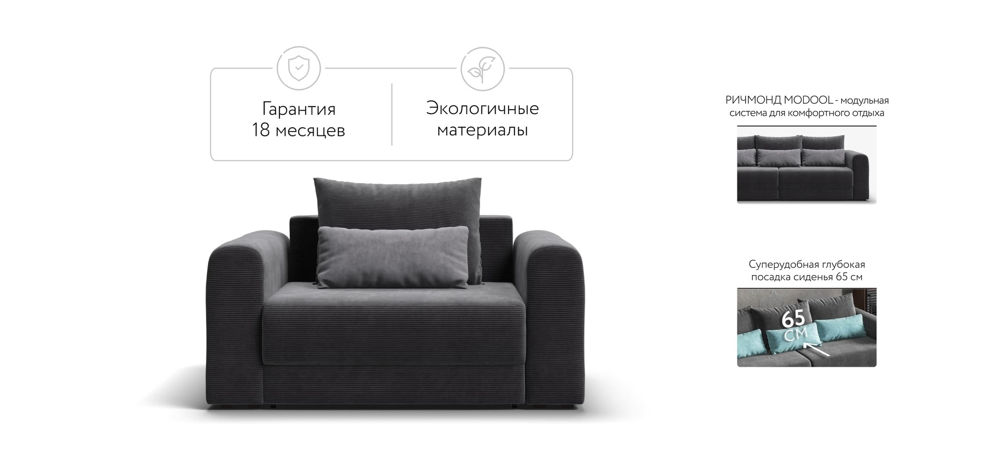 РИЧМОНД MODOOL – Модульная система для комфортного отдыха. Суперудобная глубокая посадка и высокоэластичная пена с дополнительным слоем PERIOTEK создадут максимальный комфорт во время отдыха.Широкие скругленные подлокотники, плавные линии и приспинные подушки разного размера - стильный комфорт в каждой детали.Модульная система позволит создать любую комбинацию от уютного кресла до огромного дивана для большой компании.Простой и надежный механизм еврокнижка с легкостью превратит модульную систему в комфортное спальное место.