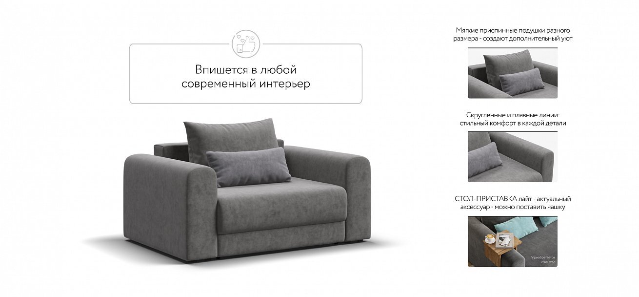 Широкие скругленные подлокотники, плавные линии и приспинные подушки разного размера - стильный комфорт в каждой детали.