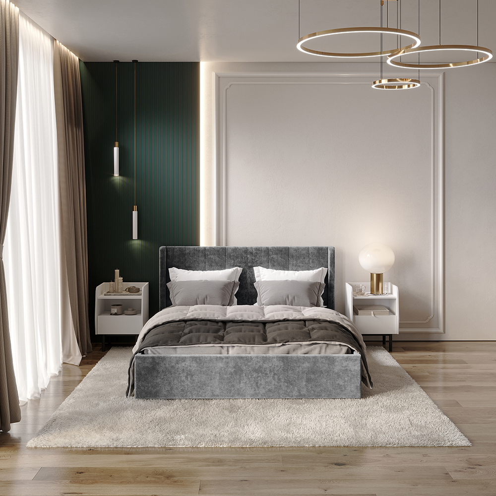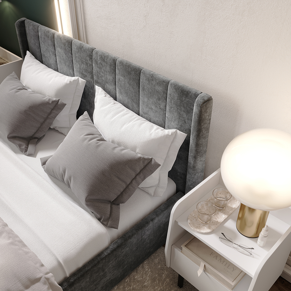 Материал мягких частей - велюр, задняя сторона - спанбонд серый. Декор изголовья - стежка.