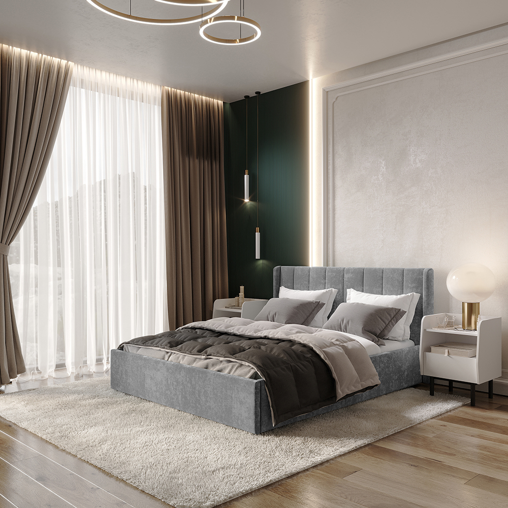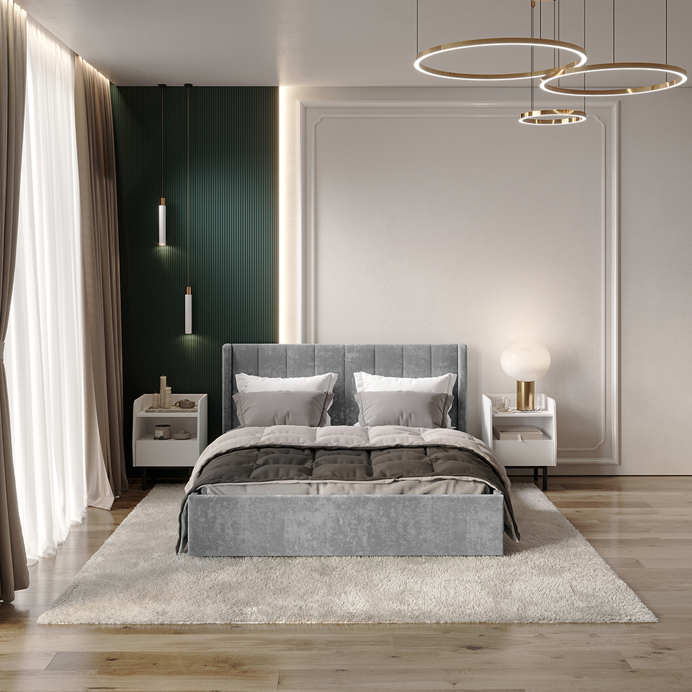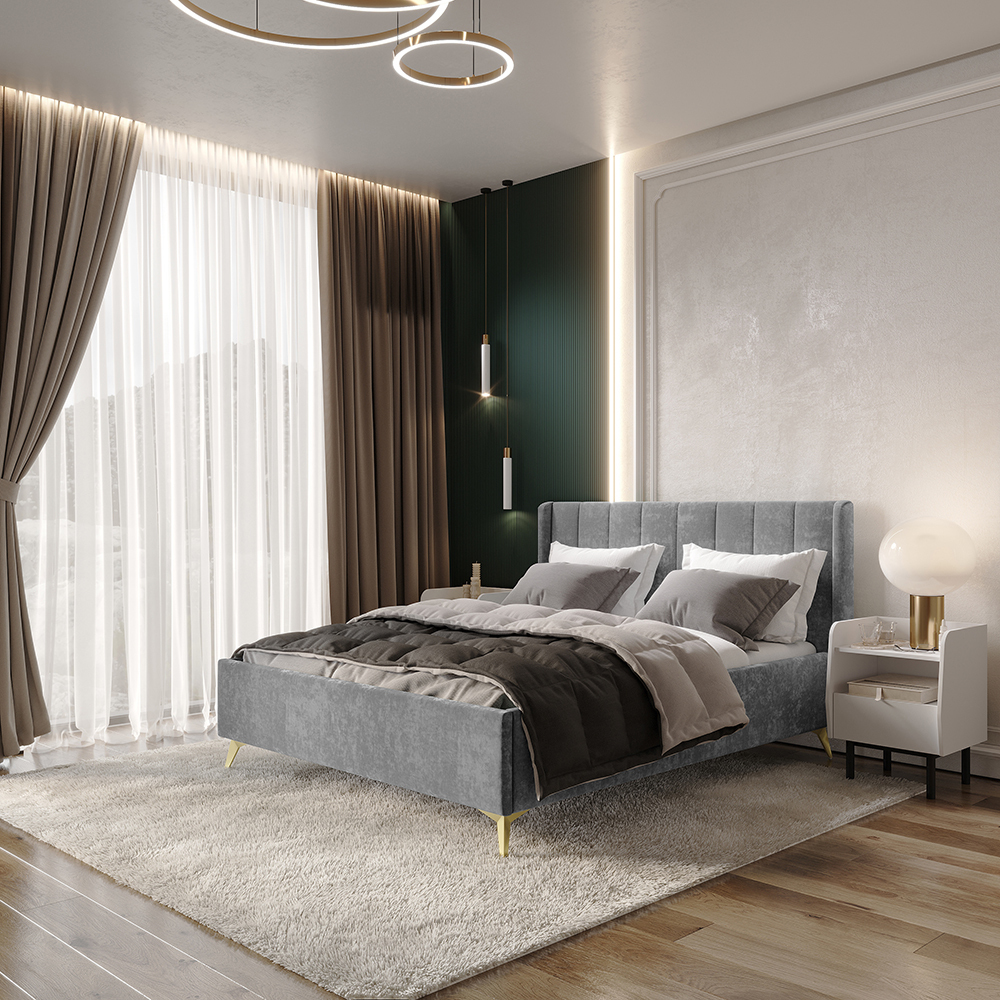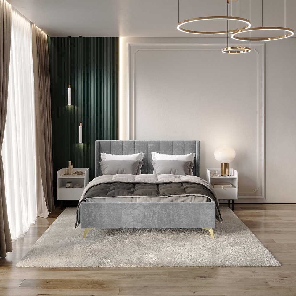 Материал мягких частей - велюр, задняя сторона - спанбонд серый. Декор изголовья - стежка.
