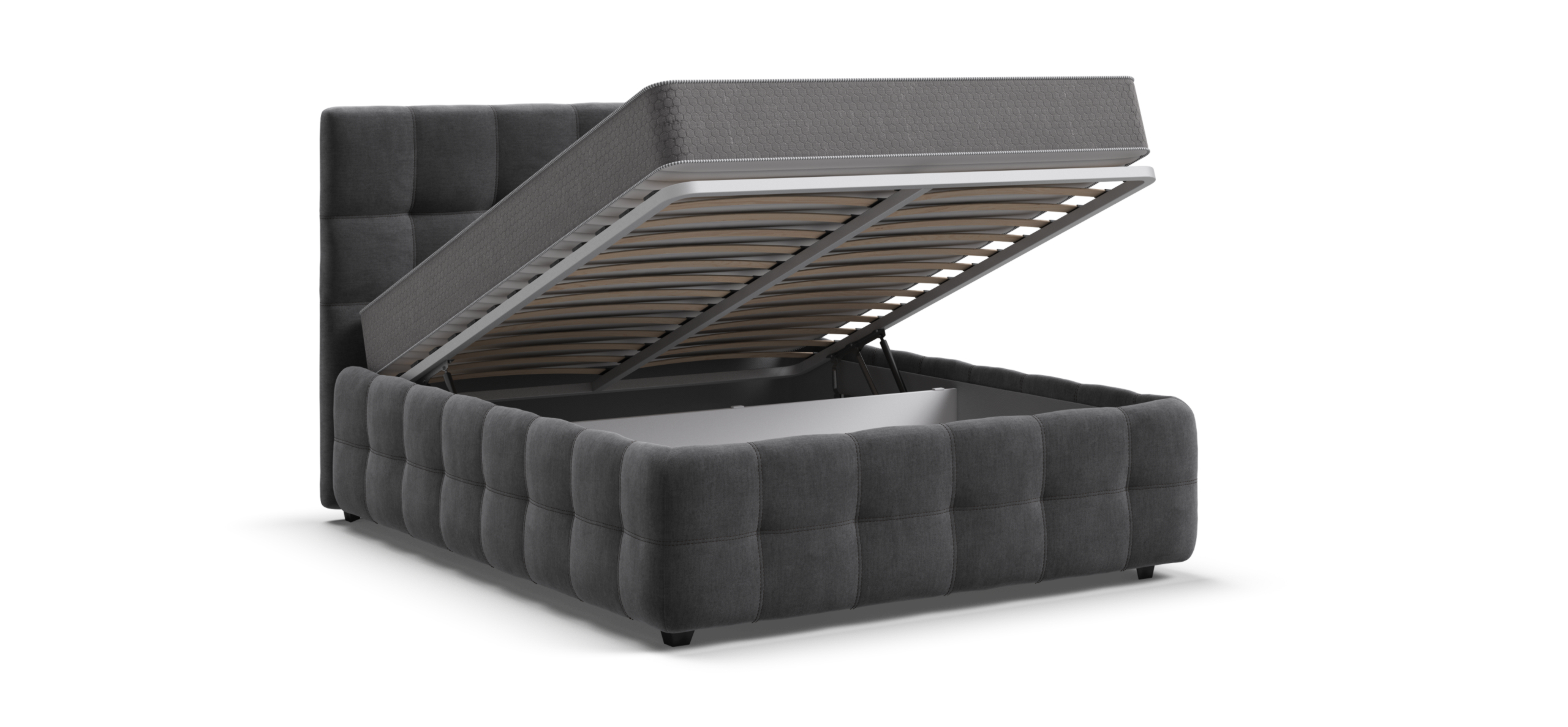 Особое внимание заслуживают газовые лифты SpaceLift, изготовленные из авиационного алюминия. Они обеспечивают лёгкое и плавное поднятие матраса, что делает доступ к отсеку для хранения быстрым и удобным. Дизайн 360 предполагает, что задняя часть спинки кровати также выполнена из основной ткани, что позволяет размещать кровать не только у стены, но и в центре комнаты, сохраняя при этом её эстетическую привлекательность.