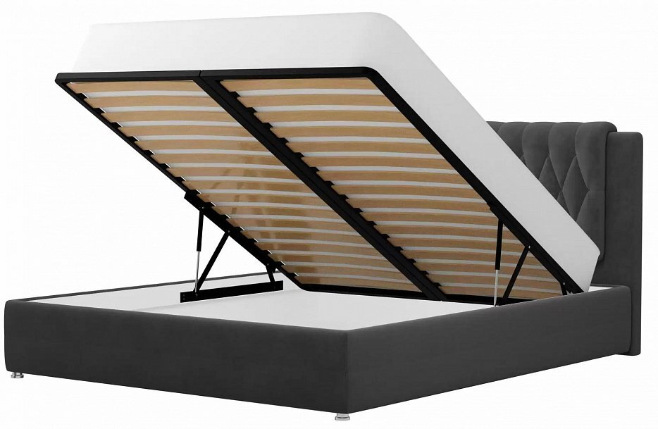 Кровать оснащена просторным **бельевым ящиком**, что позволяет эффективно использовать пространство. **Спальное место размером 1600х2000 мм** идеально подходит для комфортного отдыха. Каркас из **ДСП и ЛДСП** обеспечивает прочность и долговечность конструкции. Велюровая обивка приятна на ощупь и придает кровати элегантный вид.