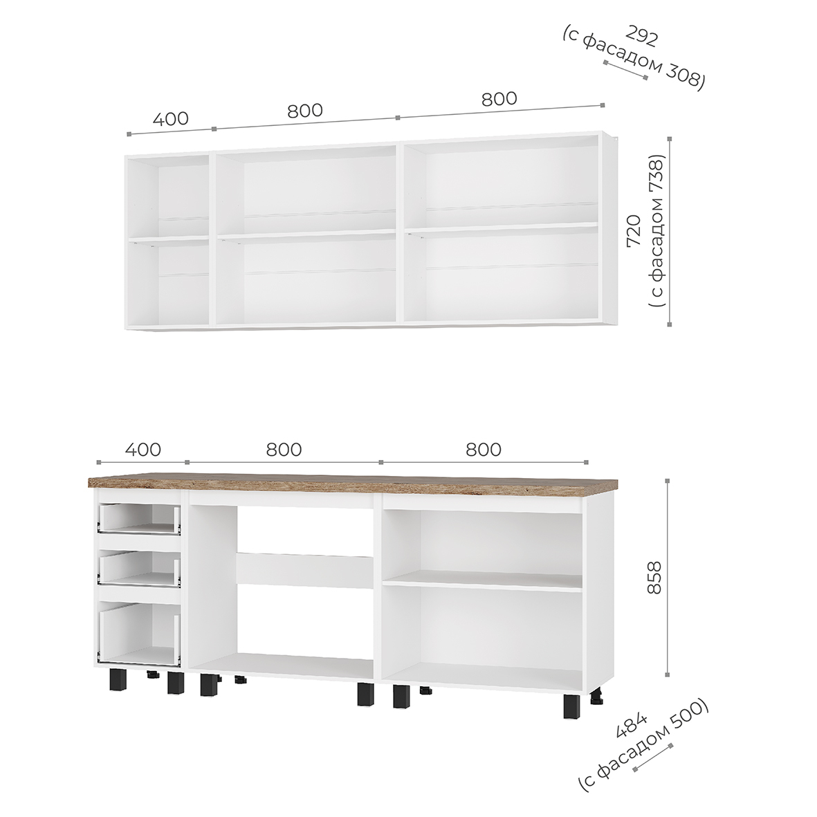 Размеры низ: ширина - 2000 мм, высота - 858 мм, глубина - 595 мм. Размеры верх: ширина - 2000 мм, высота - 720 мм, глубина - 304 мм.