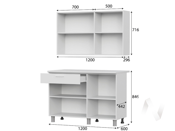 Особенности: Столешница: «Антарес» 26/1200 мм Габаритные размеры: Низ: 1200х846х442 мм (600 мм по столешнице) Верх: 1200х716х296 мм. Навеска верхних шкафов: на Р-образные навесы