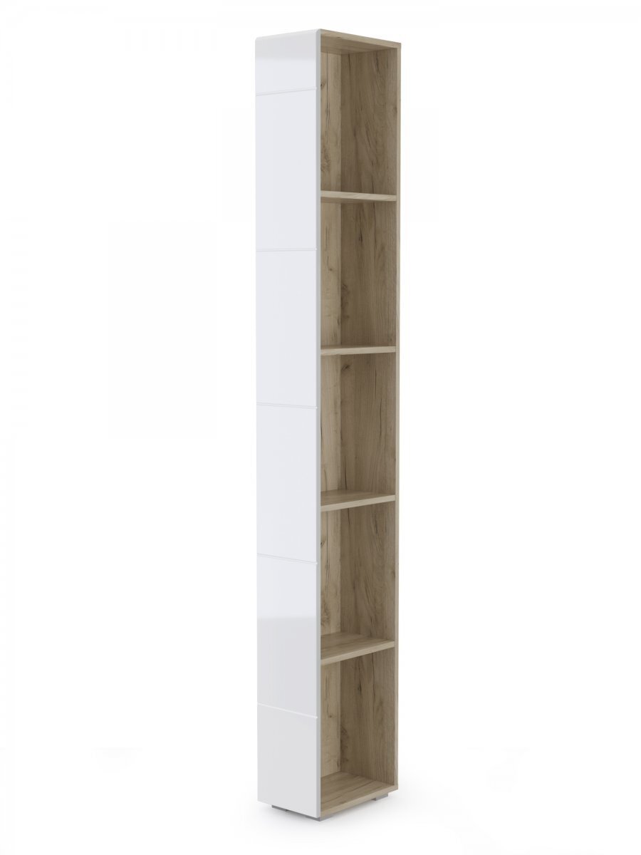 Стеллаж Лайн 10.141 - практичный и функциональный предмет обстановки прихожей. Модель располагает четырьмя открытыми полочками и может использоваться и как торцевой элемент мебельного гарнитура, и как отдельный предмет мебели. При ширине всего 22 см, стеллаж весьма практичен и функционален. На полочках достаточно места для необходимых под рукой мелочей и предметов декора. Универсальная сборка поможет Вам разместить стеллаж в интерьере прихожей с максимальным комфортом. Для безопасной эксплуатации, необходимо крепление модуля к соседним мебельным элементам или к стене. Выполнена мебель в сочетании светлого цвета натурального дуба корпуса из ламинированной ДСП 16 мм, и глянцевых искристо белых МДФ фасадов. Линейная фрезеровка фасадов и периферическая фрезеровка по типу фацета украшают мебель и определяют название коллекции. Установлена на пластиковые опоры высотой 20 мм.