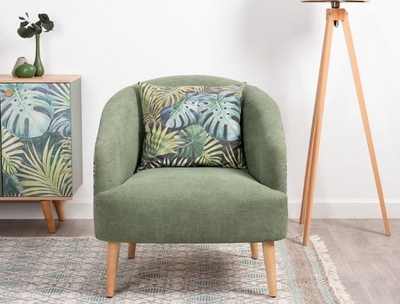 Кресло для отдыха на деревянных опорах. Спинка округлой формы переходящая в боковины. Кресло с подушкой думкой квадратной форы из ткани компаньон.