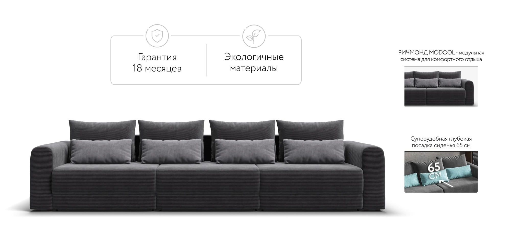 РИЧМОНД MODOOL – Модульная система для комфортного отдыха. Суперудобная глубокая посадка и высокоэластичная пена с дополнительным слоем PERIOTEK создадут максимальный комфорт во время отдыха.Широкие скругленные подлокотники, плавные линии и приспинные подушки разного размера - стильный комфорт в каждой детали.Модульная система позволит создать любую комбинацию от уютного кресла до огромного дивана для большой компании.Простой и надежный механизм еврокнижка с легкостью превратит модульную систему в комфортное спальное место.