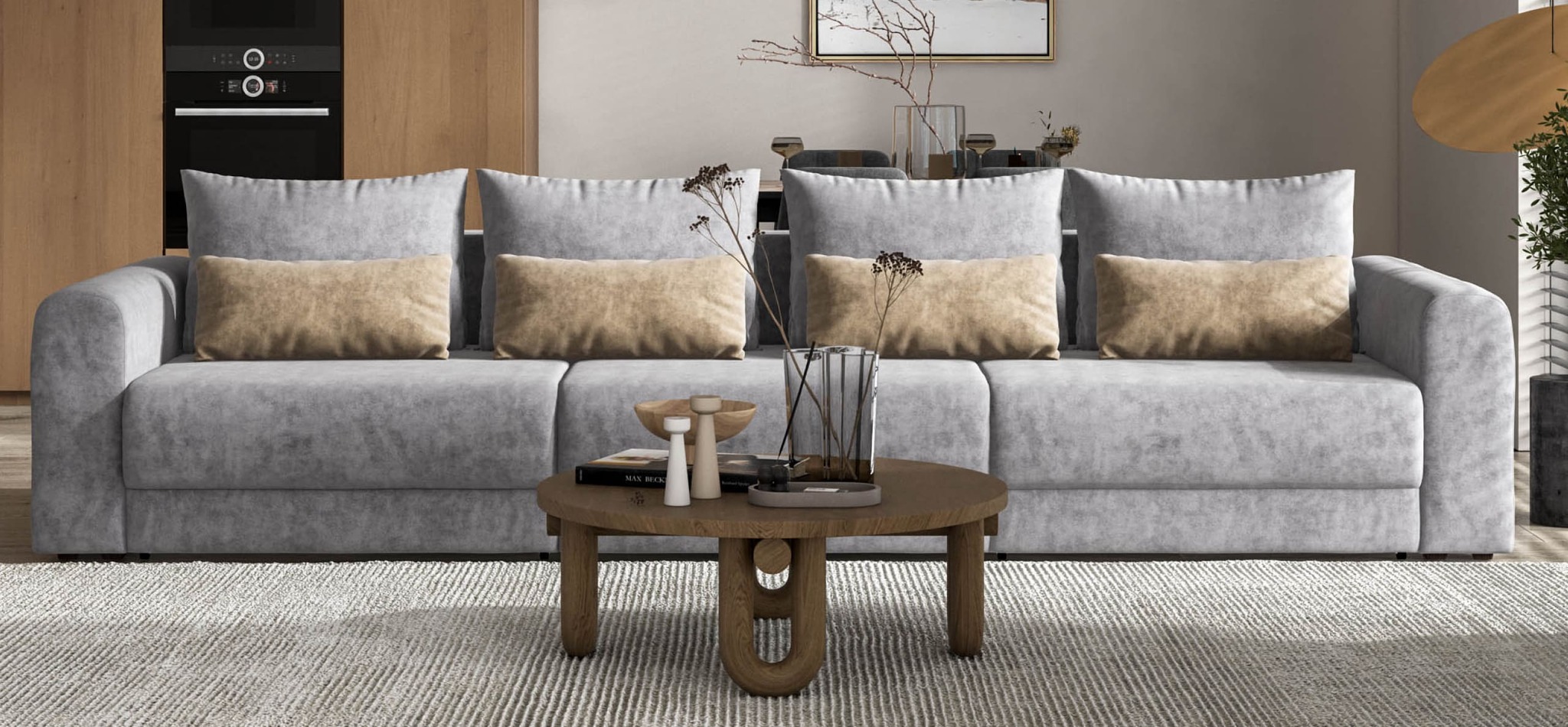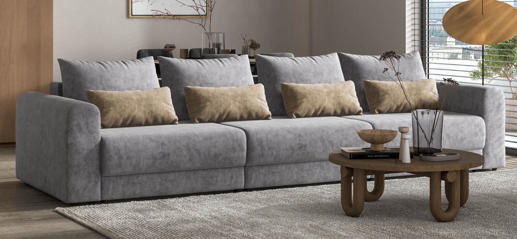 Широкие скругленные подлокотники, плавные линии и приспинные подушки разного размера - стильный комфорт в каждой детали.