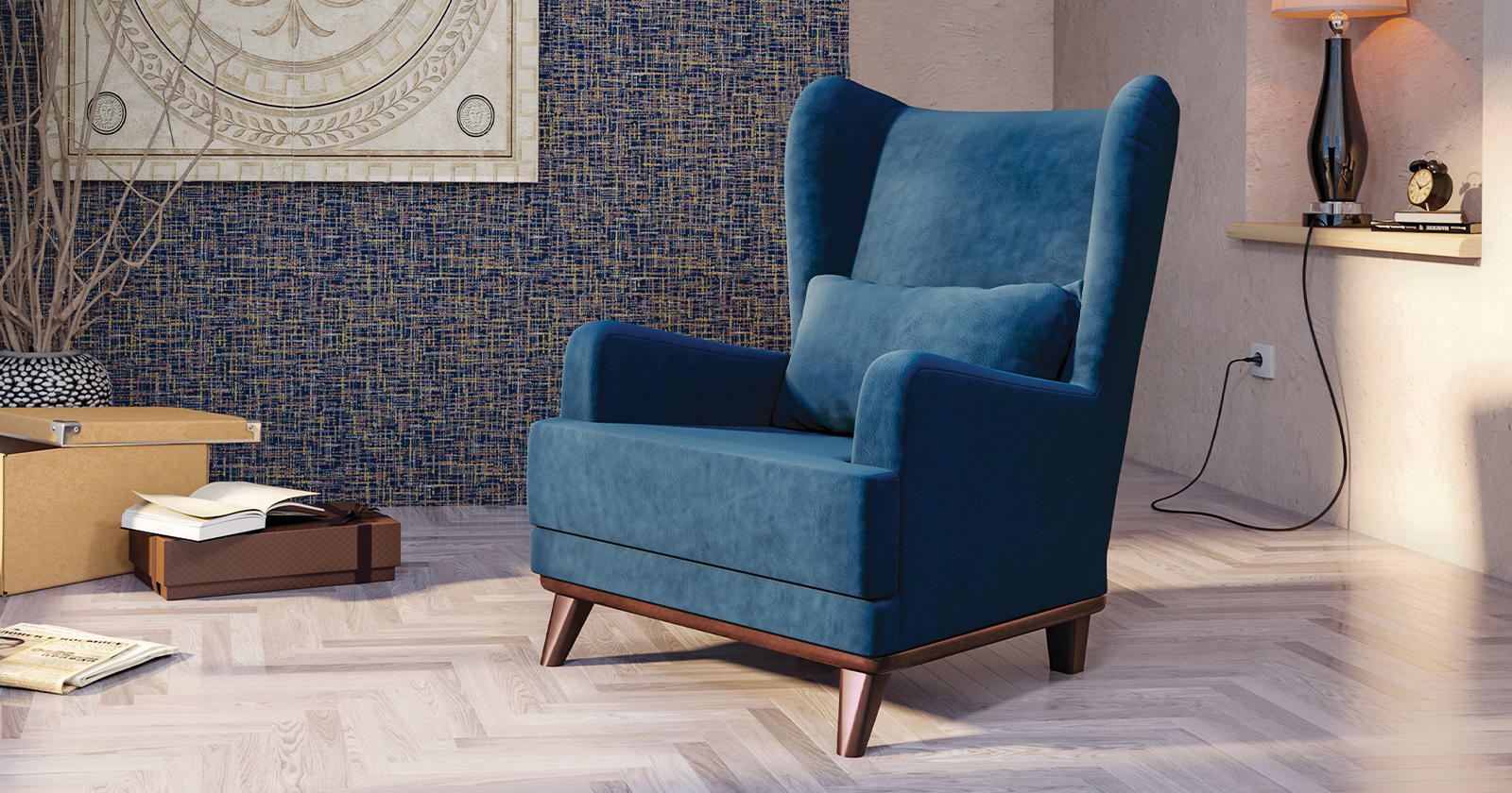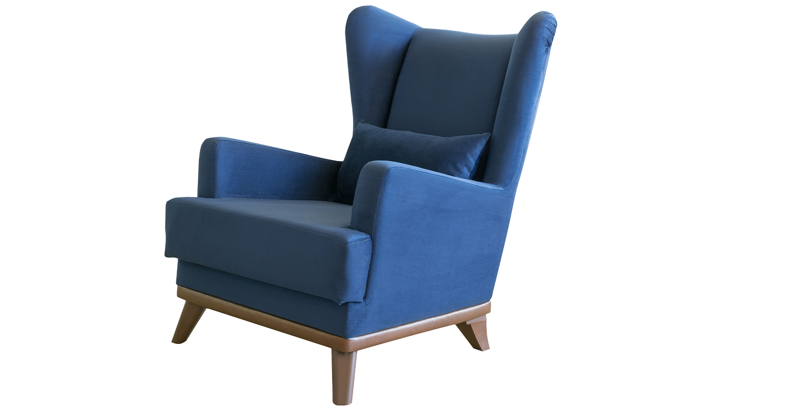 Высокая спинка с наклоном и мягкие подлокотники обеспечивают удобную посадку, дополнительный комфорт создает декоративная подушка. Царга кресла обтянута искусственной кожей в цвет опорам.